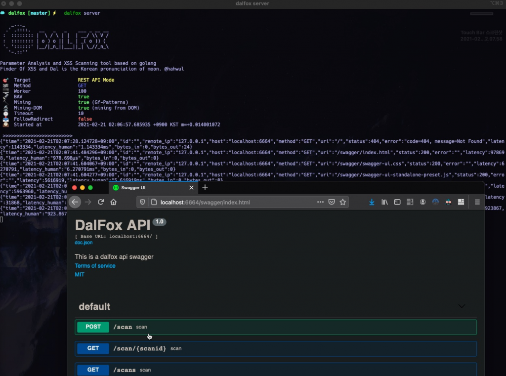 curl -X POST "http://localhost:6664/scan" -H "accept: application/json" -H "Content-Type: application/json" -d "{\"url\": \"https://www.hahwul.com\"}"