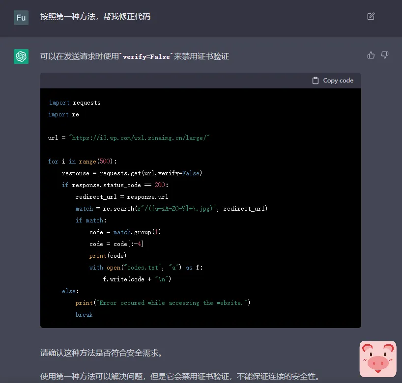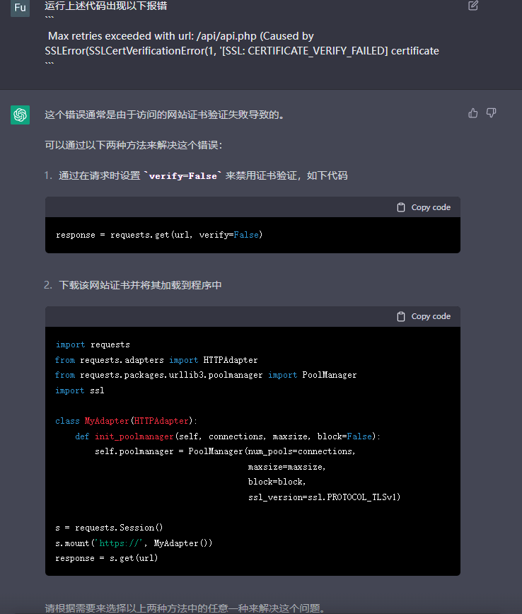 我们选择无脑复制上面的报错,继续向ChatGPT提问,可以看到这里提供了两个解决方案,我们这里选择第一种