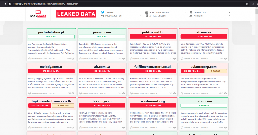 - LockBit3.0 实时更新勒索、存在数据泄露的网站 Tor地址:http://lockbitapt2d73krlbewgv27tquljgxr33xbwwsp6rkyieto7u4ncead.onion