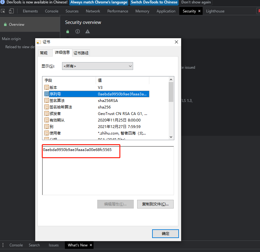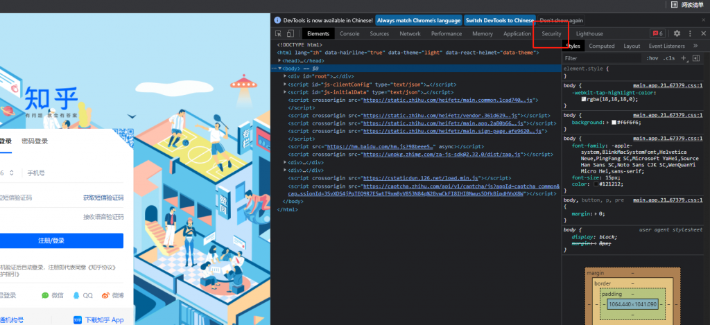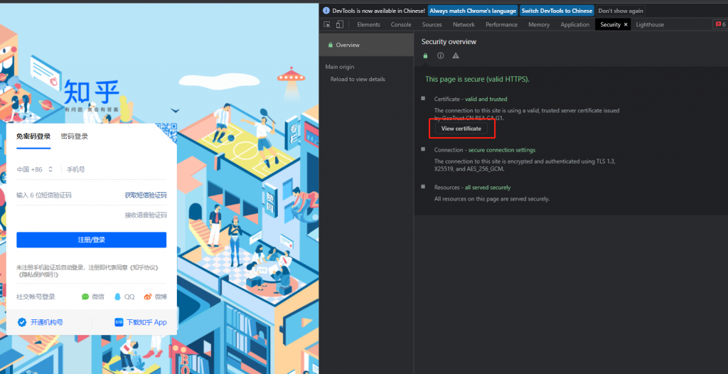 这里以知乎网站为例,我们先访问网站,然后按F12打开开发者工具,点击Security