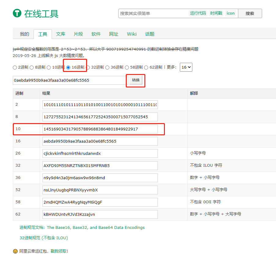 然后,我们使用在线转换工具,将16进制的序列号转换为10进制
