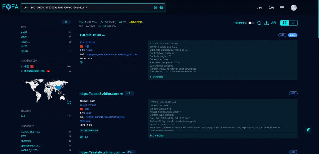 我们想确定一个网站的真实IP地址,通常现在网站都会使用https协议,用到SSL证书是必不可少的,绝大多数企业证书都是通配符证书,因此我们可以把证书的序列号拿下来然后搜索这个证书用在了哪些业务里,然后如果部分业务中没有使用CDN或者没有覆盖到CDN,源IP地址就显示出来了!
