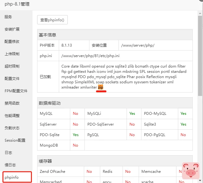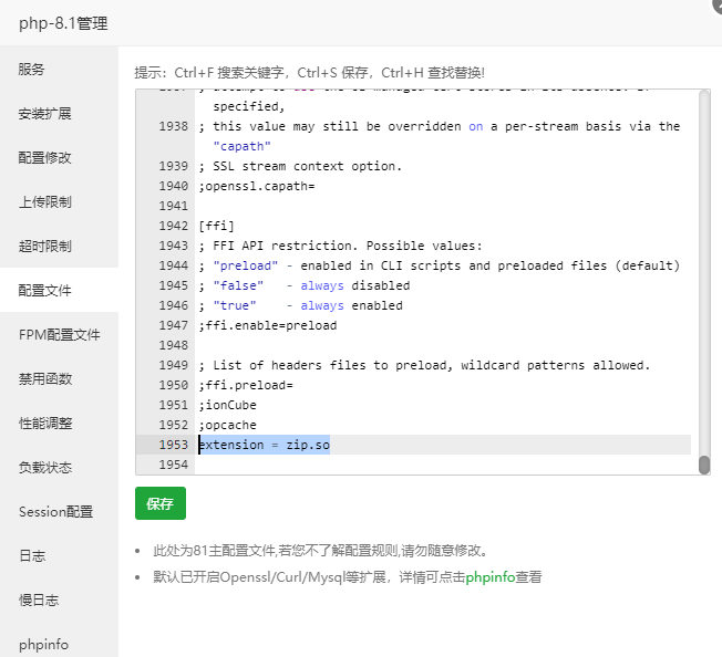宝塔中,则是进入php-8.1管理,点击配置文件,增加zip.so扩展