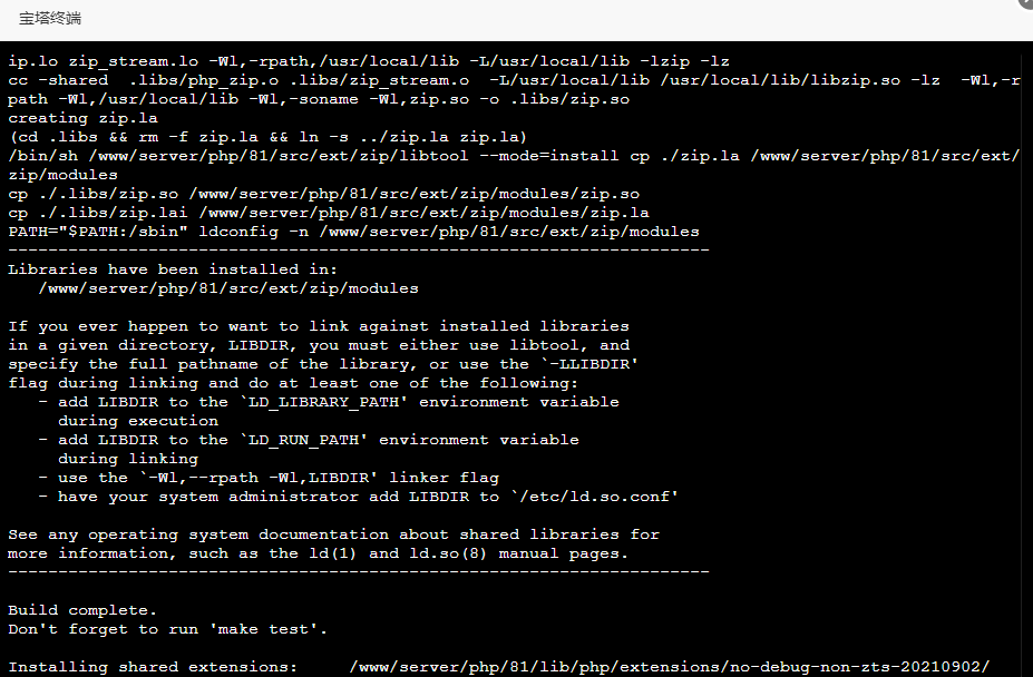 在宝塔中其实zip相关的扩展,已经在极速安装时下载好了,我们可以进入/www/server/php/81/src/ext/zip路径,您可以运行下面的命令,进行编译安装