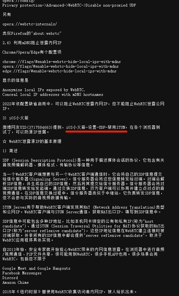 在上面我们分享的文章中,里面有讲解到一些防止WebRTC获取到源IP地址的方式,譬如在IOS的🚀软件中,通常,你需要设置-UDP-禁用STUN,默认情况下,这个选项是不被禁用的,因此,你在手机上浏览一些内容时,恰巧服务端又是使用WebRTC获取的IP地址,那么,你很有可能会被记录到真实的IP地址,导致最终被溯源