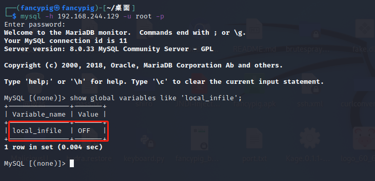 至此,实验结束,我们发现了一个有趣的事情,那就是,连接到MySQL之后,可以使用load data local infile方式任意读取电脑中的文件,这也就是为什么说,如果你构造一个MySQL蜜罐,可以主动执行上述命令,在别人连接到你的蜜罐之后,就自动读取电脑中的一些资料,从而进行溯源。
