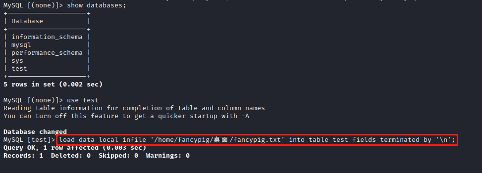 load data local infile '/home/fancypig/桌面/fancypig.txt' into table test fields terminated by '\n';