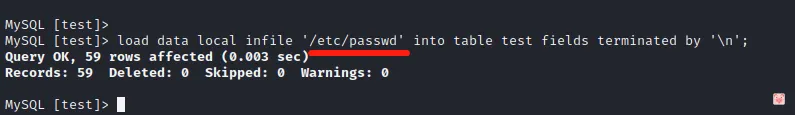 load data local infile '/etc/passwd' into table test fields terminated by '\n';