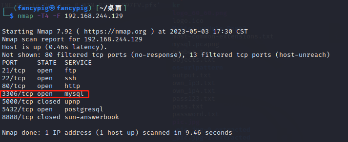 接下来,我们模拟黑客的操作,通常情况下黑客,会去扫描服务器的开放端口,这时发现有一个开放的3306端口,上面正运行着MySQL数据库