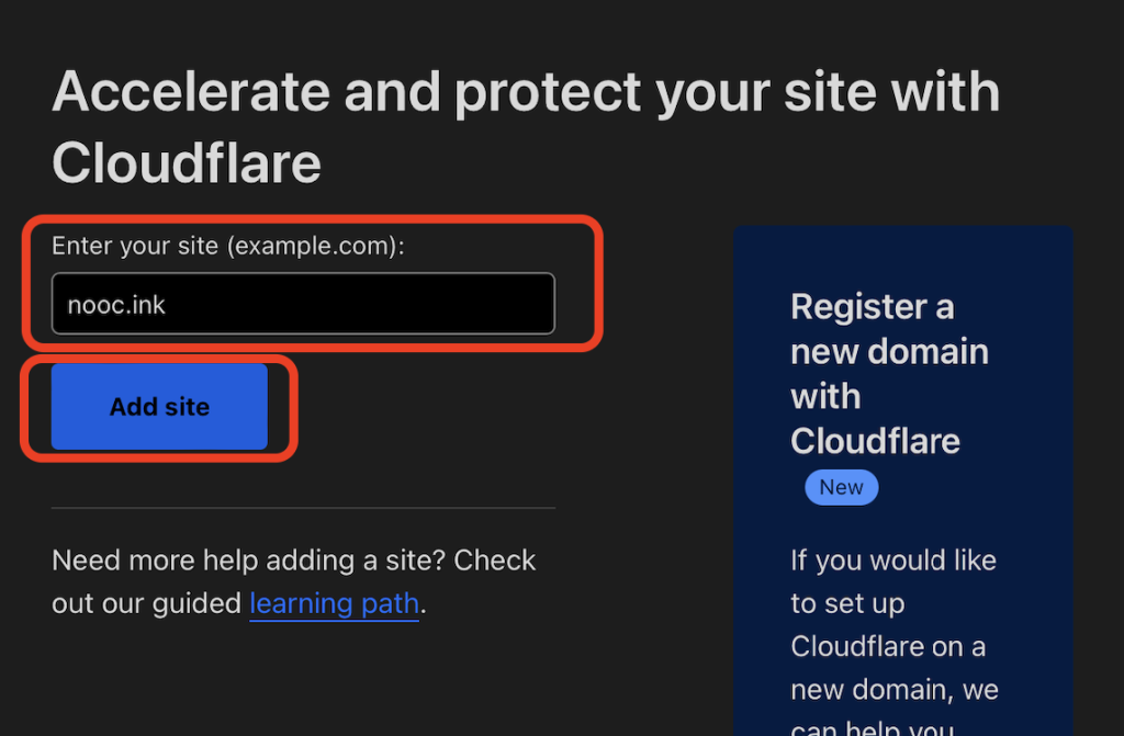 在 “Enter your site (example.com)” 处输入要转入的域名后,点击 “Add Site”: