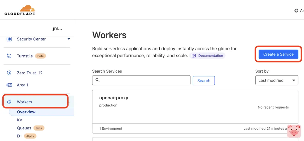 登录到 Cloudflare 的管理界面后,点击侧边栏的 “Workers” 选项,然后点击 “Create a Service” 创建一个 Worker。