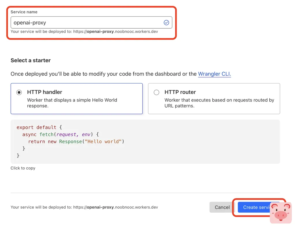 然后在创建界面中输入 “Service name” 后点击 “Create Service” 按钮新建 Worker。“Select a starter” 项先不用管。