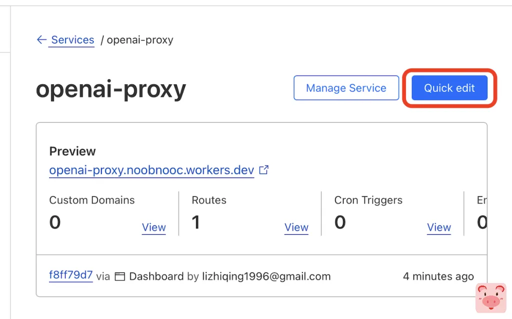 在 Worker 的管理界面,点击右上角的 “Quick Edit” 按钮编辑代码 Worker 的代码。