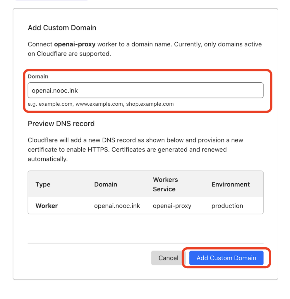 至此便大功告成。等待片刻,应该就可以通过你自己的域名来代替 OpenAI 的 API 地址了,比如在本文的例子中,想要请求 ChatGPT 的 API ,即是把官方 API 地址 https://api.openai.com/v1/chat/completions 换为我自己的域名 https://openai.nooc.ink/v1/chat/completions ,其他参数均参照官方示例即可。由于 Cloudflare 有每天免费 10 万次的请求额度,所以轻度使用基本是零成本的。⚠️ 注意请不要使用我这里的 openai.nooc.ink,因为随时可能会被我关闭🤪