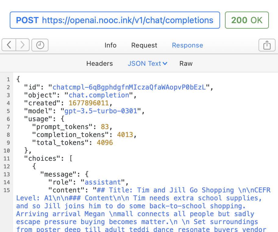 至此,便可以使用该 worker 的地址来代替 OpenAI 的 API 地址了。比如想要请求 ChatGPT 的 API 时,把官方文档中的 https://api.openai.com/v1/chat/completions 替换成 https://openai.workers.dev 即可(注意这个地址并不存在,是需要换成自己刚刚创建的 Worker 的地址)。