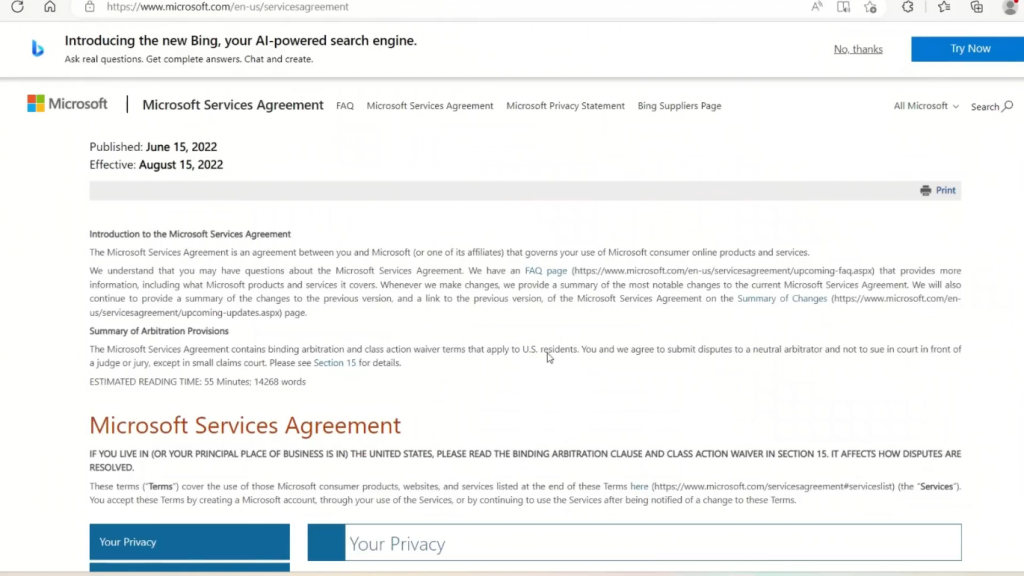 原因是大多数大型语言模型有一个非常小的上下文窗口。但有一个新的模型,你其实不需要做这些事。embeddings的方法可能会变得过时。只是为了告诉你为什么上下文窗口如此重要,我从微软网站上摘取了这个服务条款的文本。