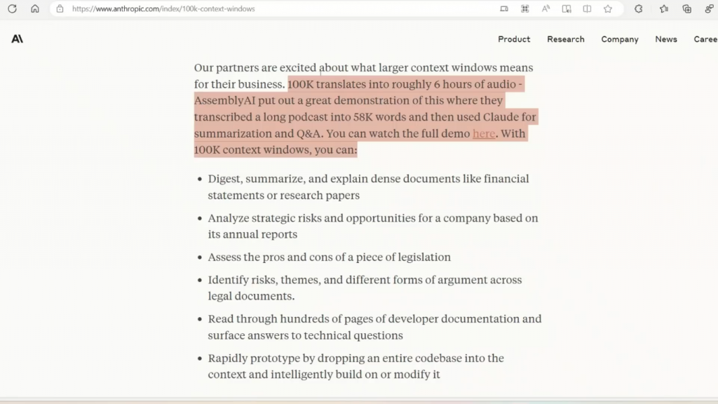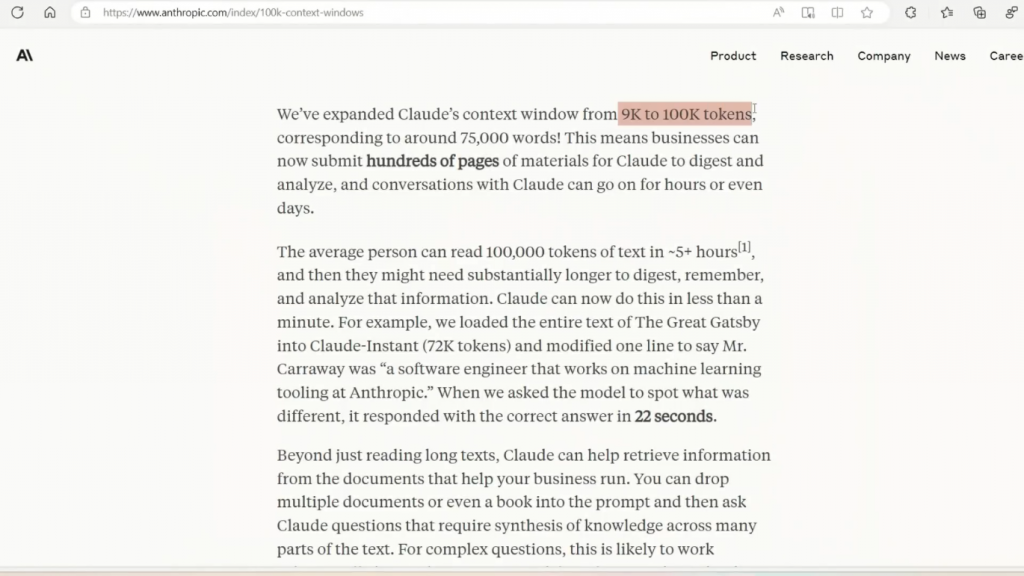 目前向公众开放的具有最长上下文窗口的商业模型实际上是来自ANTHROPIC的Claude,具有9,000 tokens的上下文窗口,比GPT-4的8,000窗口的上下文窗口还要长。而我指的是可用的那个,还不是32,000令牌。但今天,他们宣布了新版本的Claude,它有一个巨大的上下文窗口,有100,000个令牌。