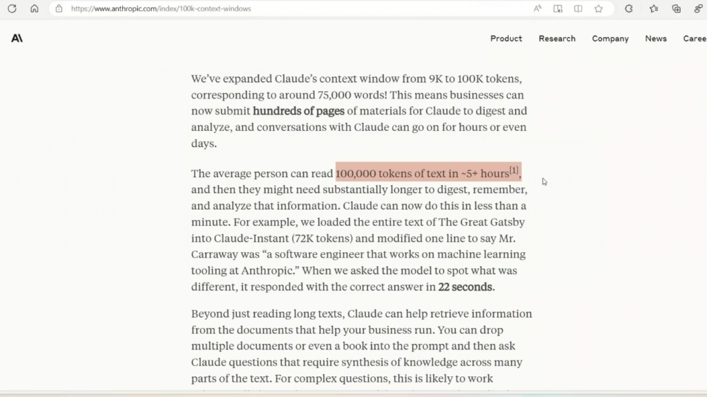 现在,这意味着你可以将数百页的多个文件送入Claude,并从这些页面中实际检索信息。现在,由于它有如此巨大的上下文窗口,与Claude的对话可以持续几个小时甚至几天,而且它仍然会记住所有的信息。现在,为了参考100,000个令牌有多大,一个普通人将需要大约5个小时来阅读。