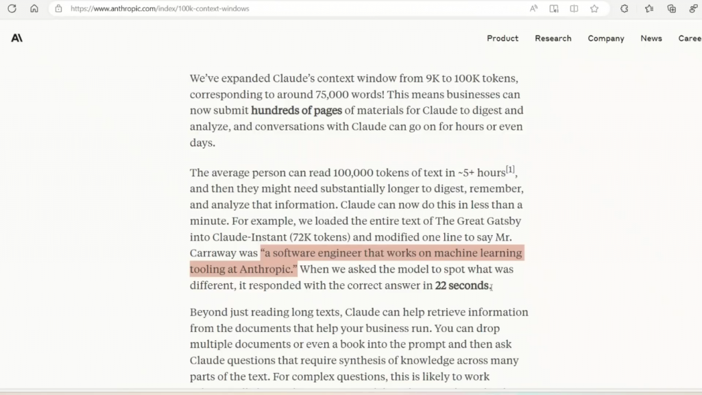 实际上,他们需要花大量的时间来消化、记忆、和分析他们刚刚读到的信息。但对于Claude来说,这只是一个几分钟的问题。例如,在这里,他们把整个《了不起的盖茨比》装入Claude,大约有72,000个令牌,然后修改了文本中的一行,