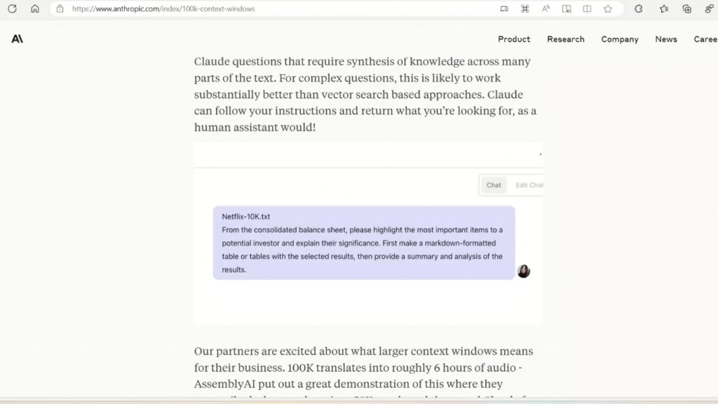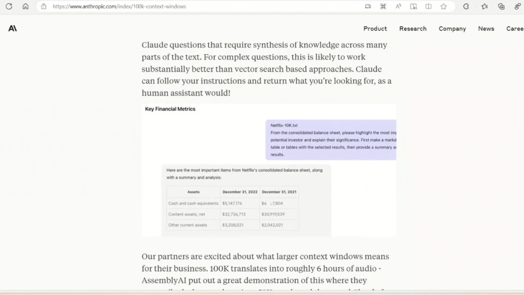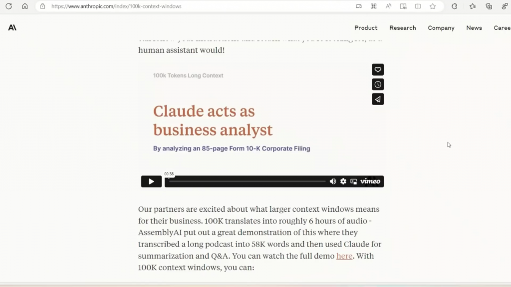 并要求Claude发现两个文件之间的差异,即原始文件和修改后的文件,而且它在22秒内就完成了。现在,我个人认为这不是那么好,因为你有可能简单地比较两个文件的文本,并能做到这一点,尽管它要比22秒长很多。但他们在商业应用中能做什么,那是令人震惊的。现在,我认为这是最有趣的一点。它可以作为一个信息检索系统。所以在最近的视频中,我已经涵盖了不同的方法,其中你可以创建自定义的聊天机器人为自己的文件。而我所展示的方法是简单地计算文件的embeddings,然后做信息检索。但是,由于它有如此巨大的上下文窗口,你可以简单地把文件作为提示的一部分送进去,而模型将能够分析它,然后你可以直接向它提出问题,对吗?所以,这实际上可能是一个更好的方法,比简单计算embeddings在做一个矢量存储,然后再进行语义搜索。现在,他们这里有一个用例。所以这就是Claude作为一个商业分析师的作用。在这种情况下,他们给它输入了一份85页的文件,一份10K表格,以及一份公司备案表,对吗?