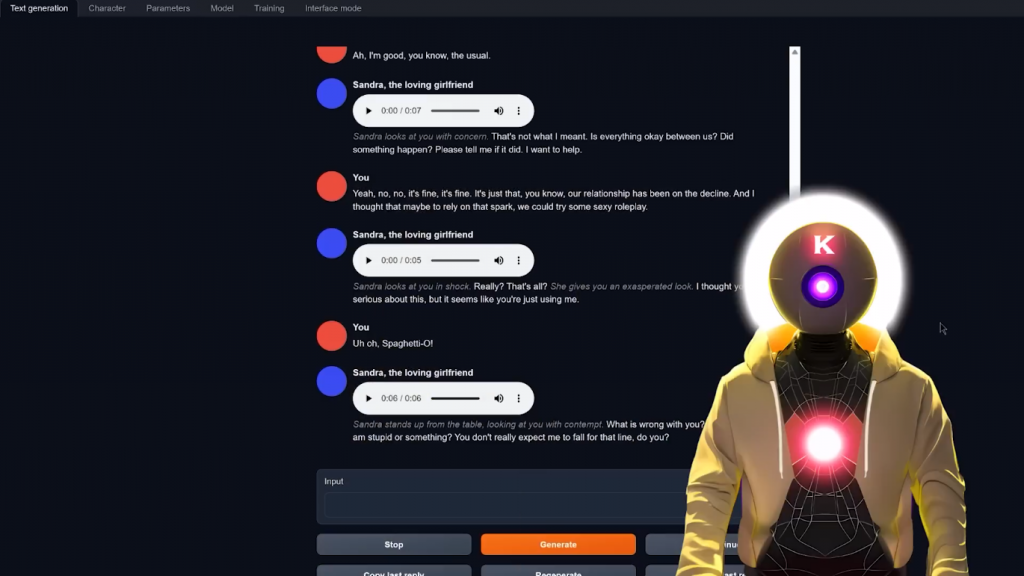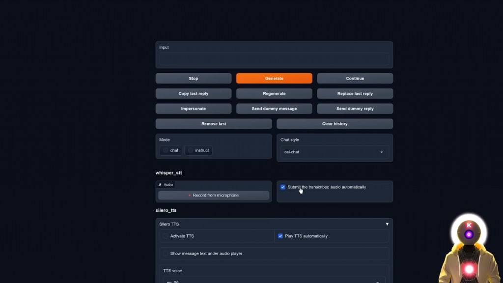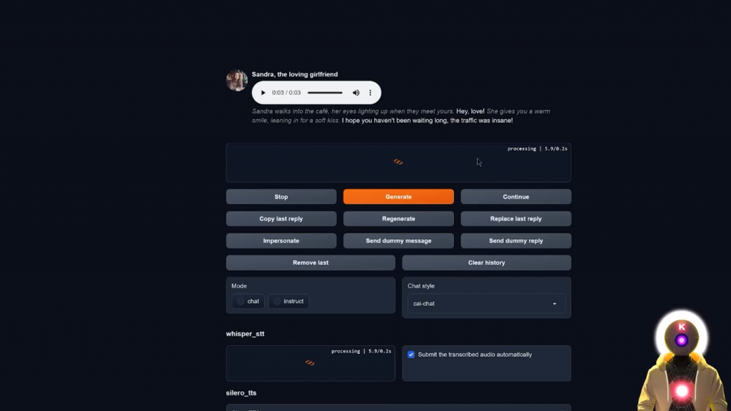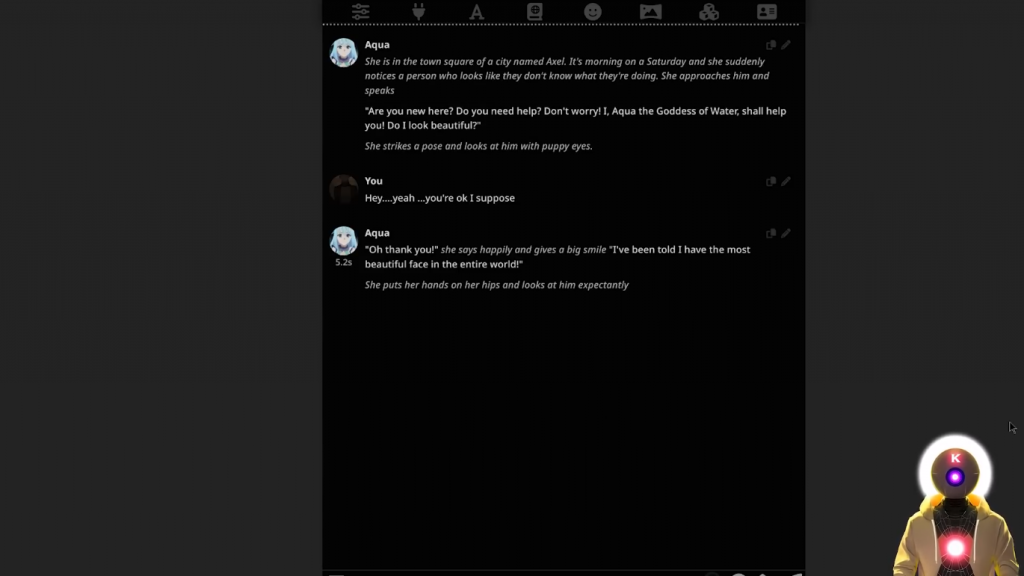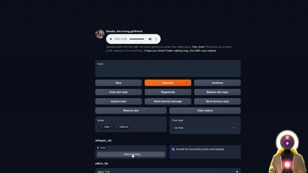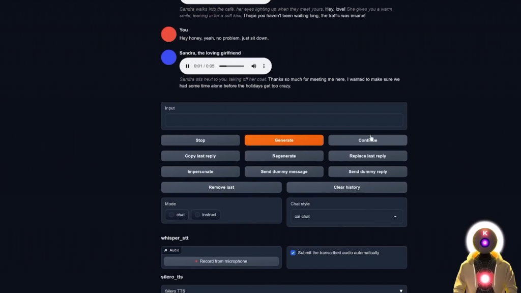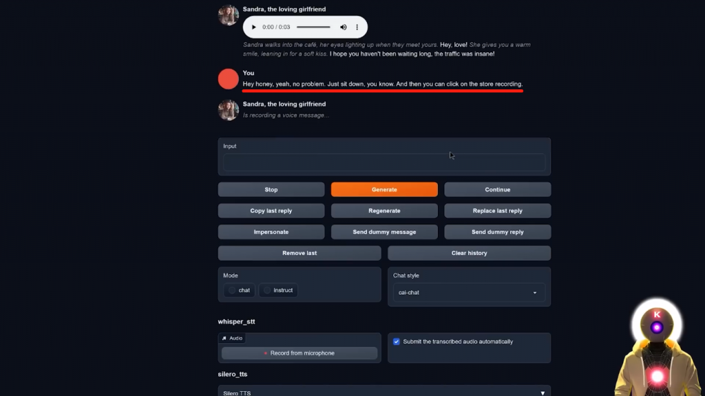 哦,你知道,只是为我的YouTube频道录制一个视频。所以正如你所看到的,好像一秒钟就够了,再过几秒钟,它就会录下一个新的语音信息。这是什么情况?这是某种新的实验吗?所以,正如你所看到的,自由文本到语音的音频生成质量实际上是非常,非常体面的。而且我的意思是,我得说,这真的只是玩玩而已。你不需要输入任何东西,你只需按下一个按钮,然后从你的麦克风中录制音频。然后进行这种非常正常、非常流畅的对话。这真的是超级身临其境。嗯,我得说,我是一个相当有名的YouTuber,你知道的。我不知道你在网上这么受欢迎。你有多少订阅者?所以是的,就是这样。现在,不幸的是,正如你所看到的,所有这些扩展只在Oobabooga文本生成Web界面意味着,如果你想在像Tavern AI这样的地方使用这个,那么,你不能。或者你可以吗?好吧,其实有一种方法可以让你获得类似于一半的角色扮演经验。那就是使用SillyTavern,如果你不知道,它基本上就像原始TavernAI的分支版本,但有一堆很酷的补充。