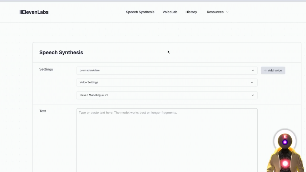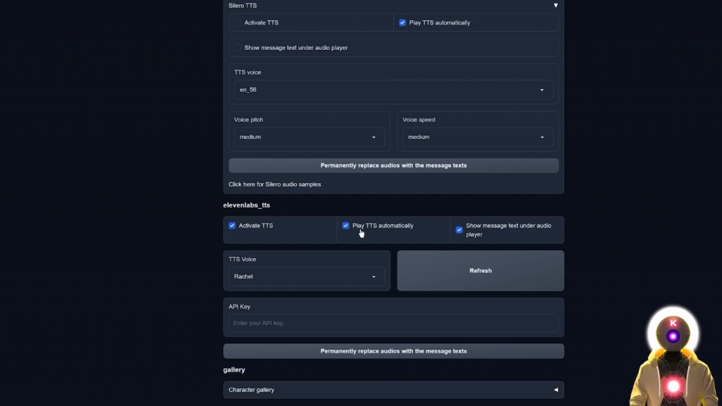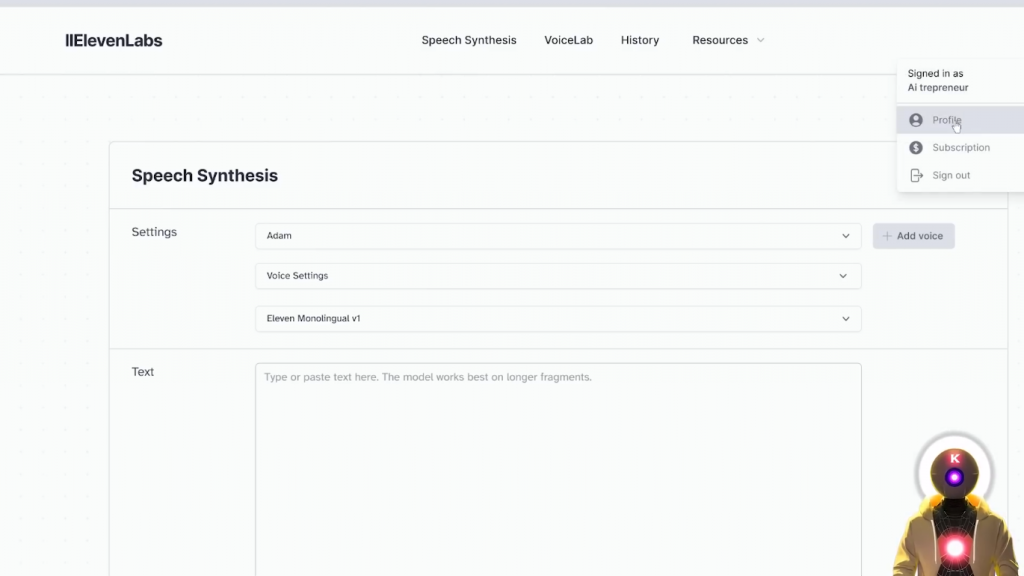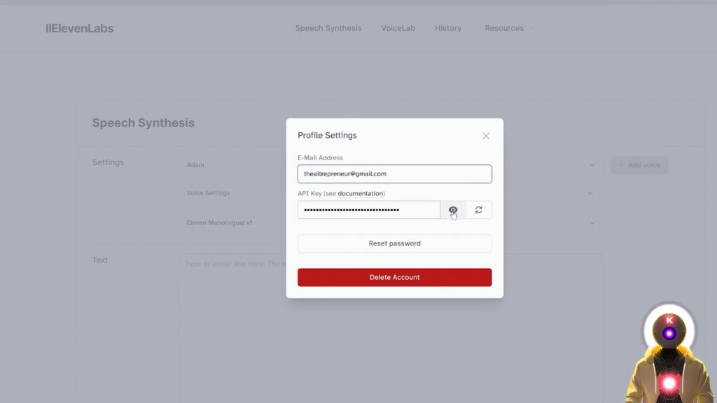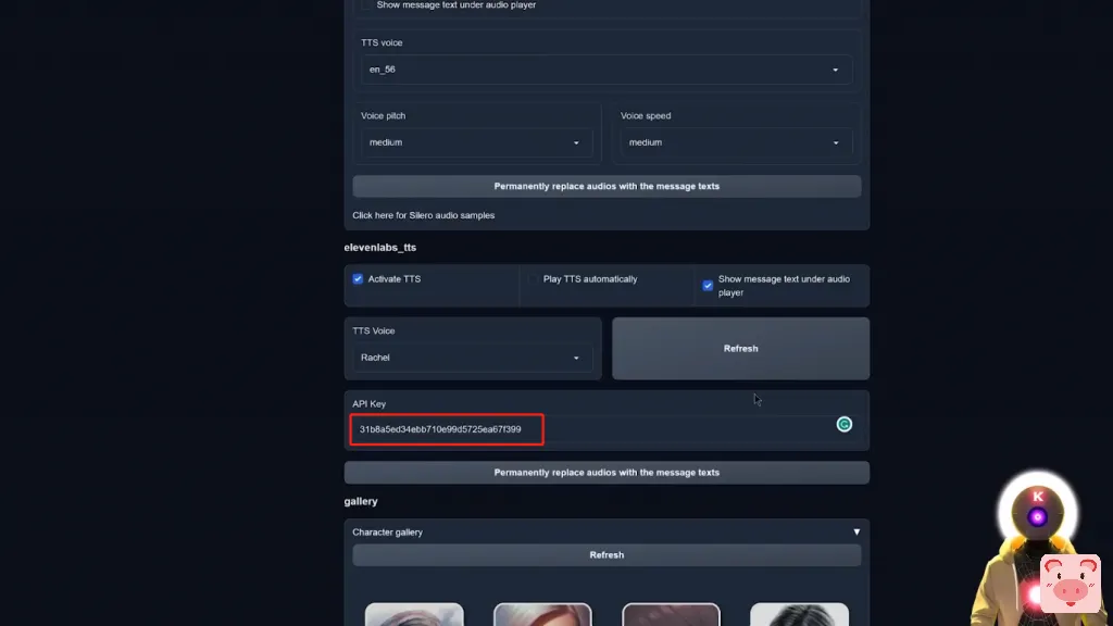 然后你要选择一个声音,在这里你要输入你的API密钥。要找到elevenlabs的API,你当然需要在elevenlabs网站上创建一个新的账户,然后你要点击你的个人资料图片,进入个人资料,