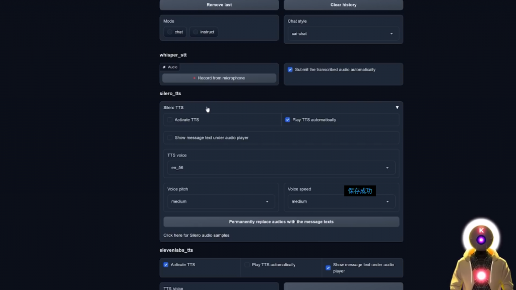 令这个体验变得如此独特的,主要是两个神秘的元素:语音转文本和文本转语音功能。首先,Whisper,一个开源的神经网络,可以准确地识别语音并将其转化为文本。此外,我们还有两款文本转语音的扩展:Eleven Labs TTS 和 Silero TTS,提供了付费和免费的选择。