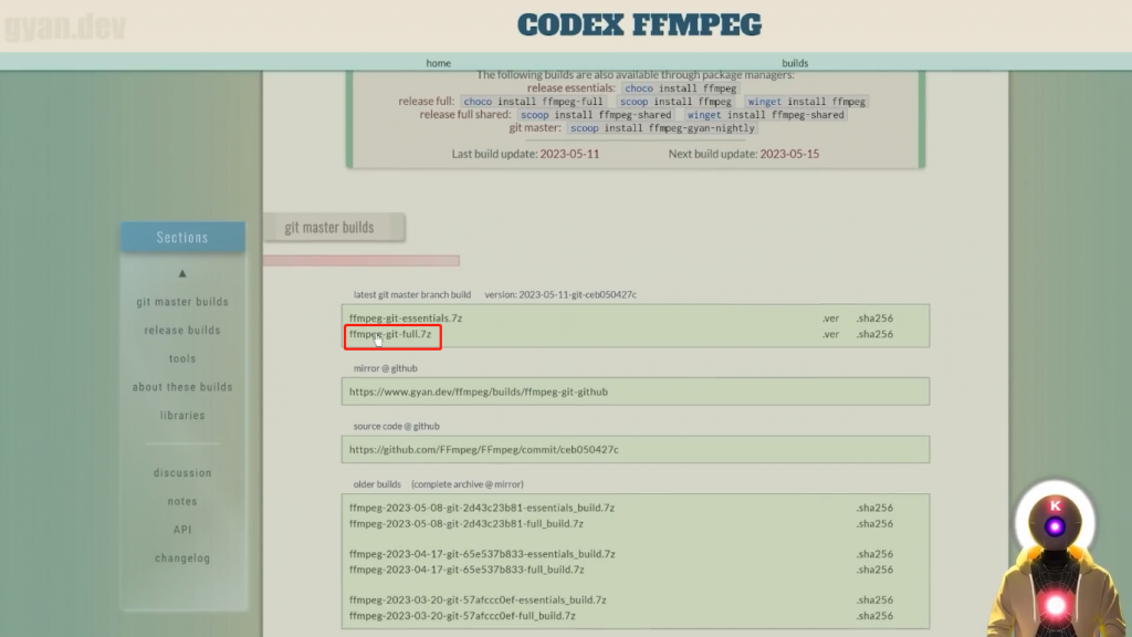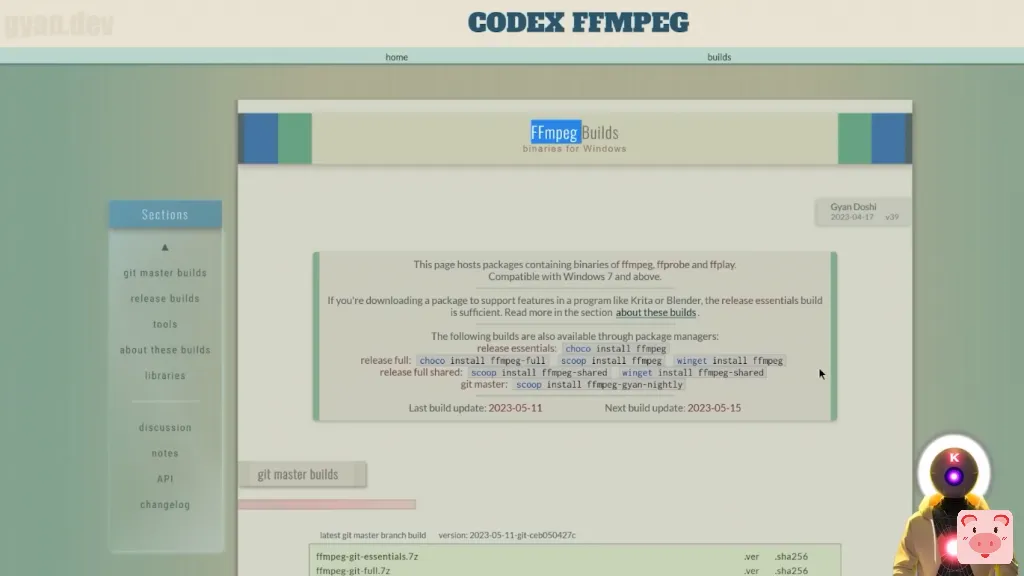 旨在处理视频和音频文件,安装这个实际上是非常简单,所以如果你还没有安装它,这里是如何做到的。首先,你要点击下面描述中的链接,你会到达这个页面,然后你要向下滚动,并点击ffmpeg-git-full.7z,这将下载压缩包到你的电脑上,