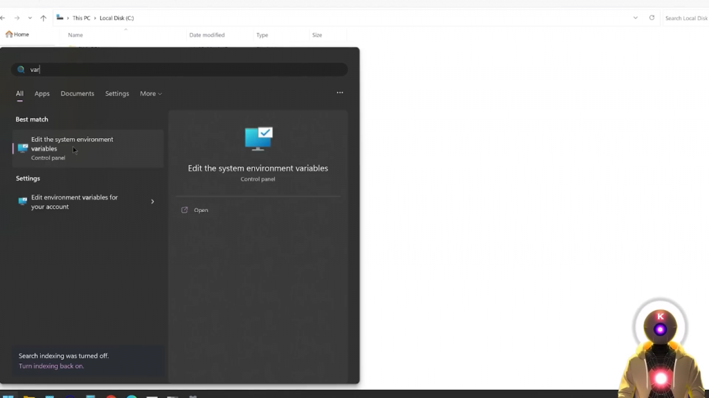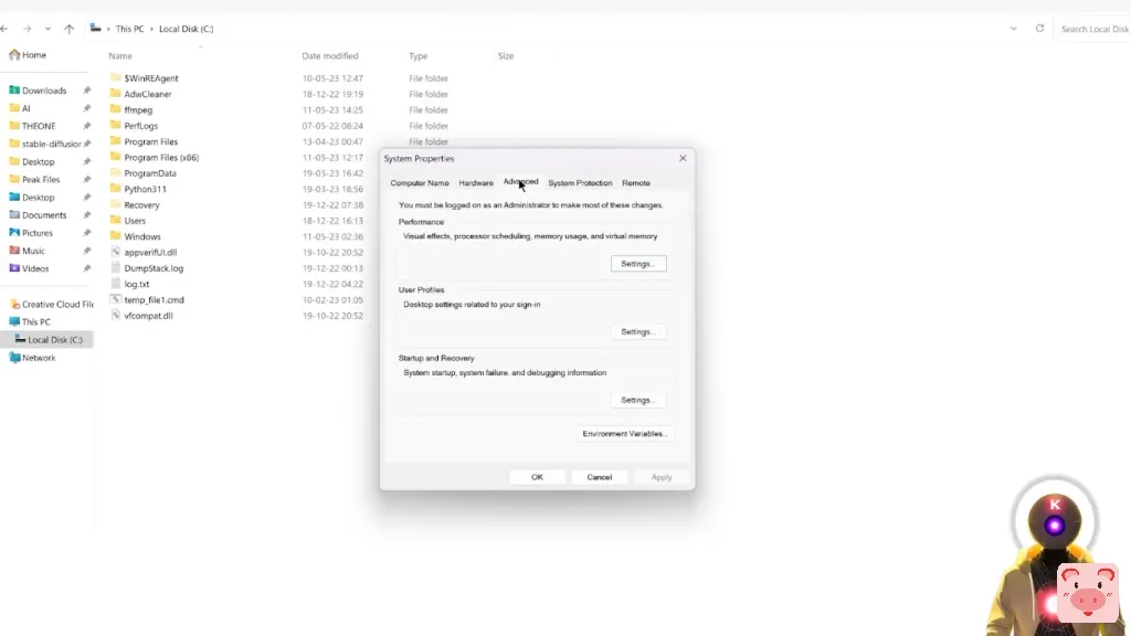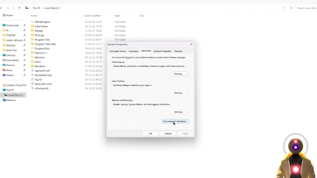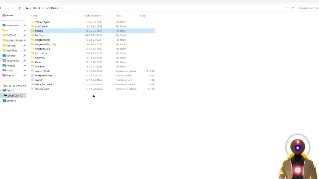 所以你会看到一堆文件,如Users、Windows、Program Files文件,然后你会看到ffmpeg。所以,然后在你的启动菜单中,你要去寻找编辑系统环境变量,