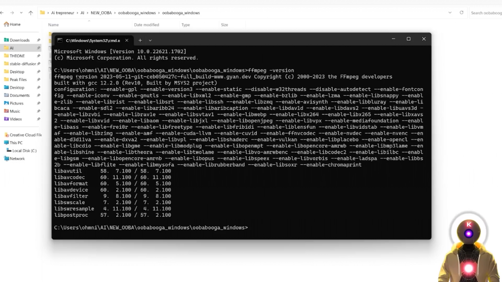 你可以看到,确实,我们有最新版本的FFmpeg,为了以防万一,对现在你应该重新启动你的电脑,现在它确实为我工作,没有重新启动,但你可以这样做,以防止它不工作。现在,好了,差不多结束了,因为我们现在需要做的是启用扩展。为此,你要做的就是右击webui.py文件,点击用记事本编辑,然后在第146行,在python server.py之后,你要输入以下参数,--extension whisper_stt sailero_tts elevenlabs_tts