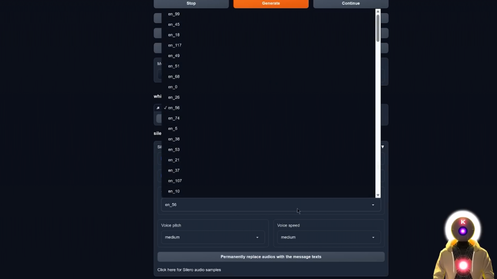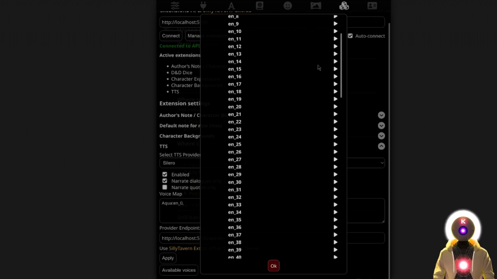 所以要注意你说的话。现在如果你想使用Silero文字转语音,你可以停用Elevenlabs,并在这里激活TTS。确保自动播放TTS被选中,然后确保你也选中了在音频播放器下显示消息文本。然后在这里你要选择声音,如果你不知道选择哪种声音,你可以点击这里看音频样本,然后你会看到这里有一堆声音供你选择。