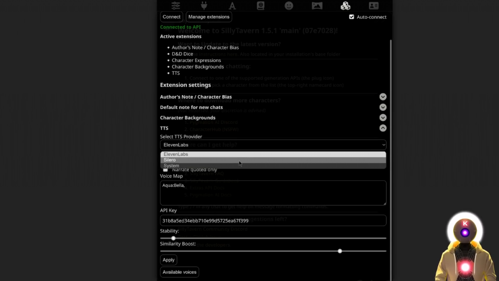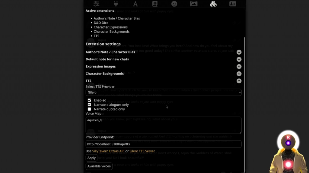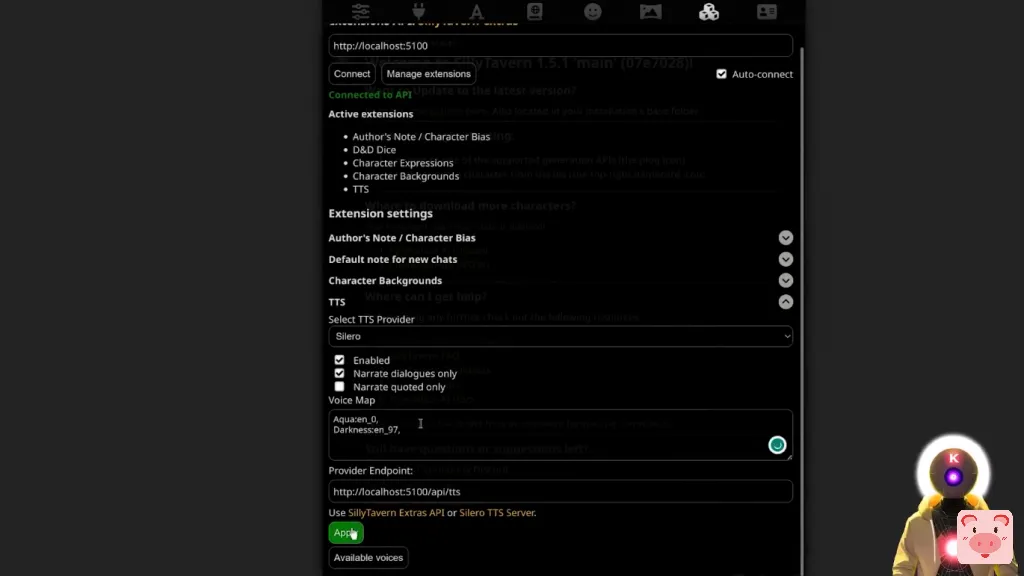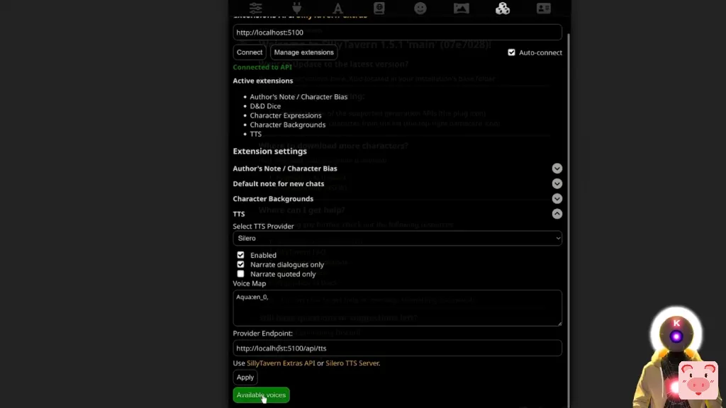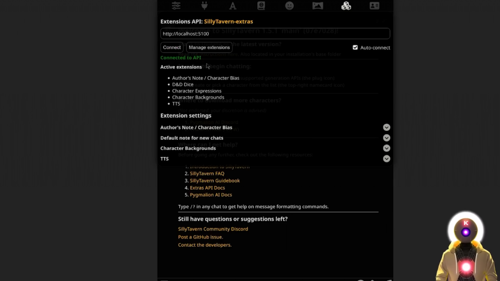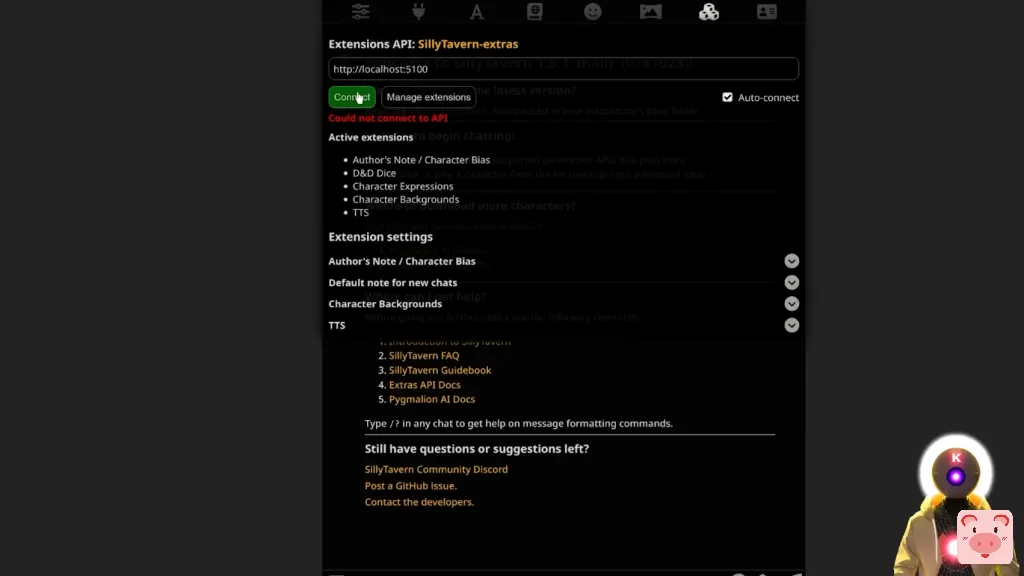 但问题是,Silly Tavern只是一个用户界面。这只是一个界面。而为了能够得到像文字转语音这样的东西,或任何其他扩展,你实际上需要安装其他东西。这就是 Silly Tavern 的附加功能。所以正如他们所说,这基本上是一堆用于各种 Silly Tavern 扩展的API。运行起来真的不难,但会花一点时间。