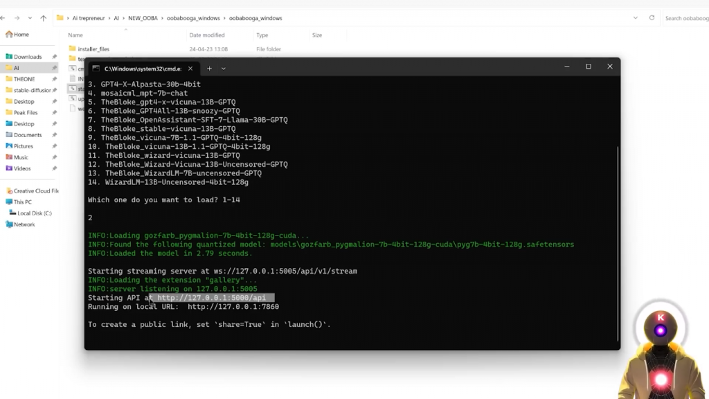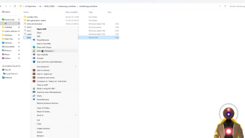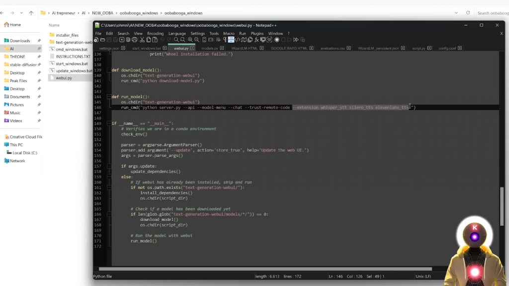 所以,我会在下面的描述中留下这个命令的链接。而在你完成之后,并且你运行了最新的命令,你会看到这个localhostURL,这意味着一切都应该工作顺利。现在,关键的一步来了,因为我们需要同时运行三个不同的东西。是的,我不是在开玩笑,因为我说过,Silly Tavern只是一个UI,就像TavernAI一样,意味着你需要一些东西来运行模型,然后将其连接到UI。为此,我们当然要使用Oobabooga文本生成Web界面。如果你想和Silly Tavern一起运行,你要在webui.py文件上右击,用记事本编辑,