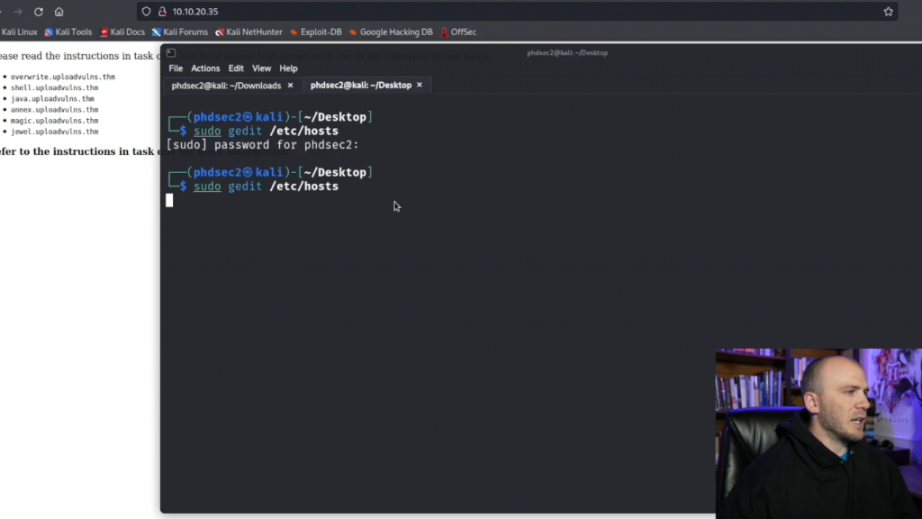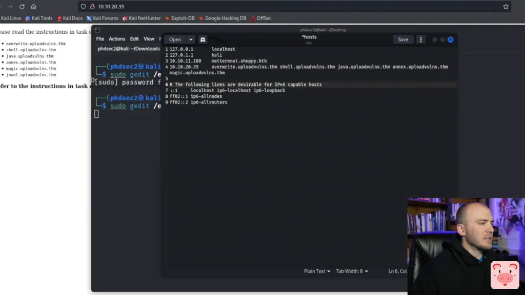 而你有所有不同的URL,我们将使用不同的漏洞。所以在你的终端,你可以gedit /etc/hosts文件。
