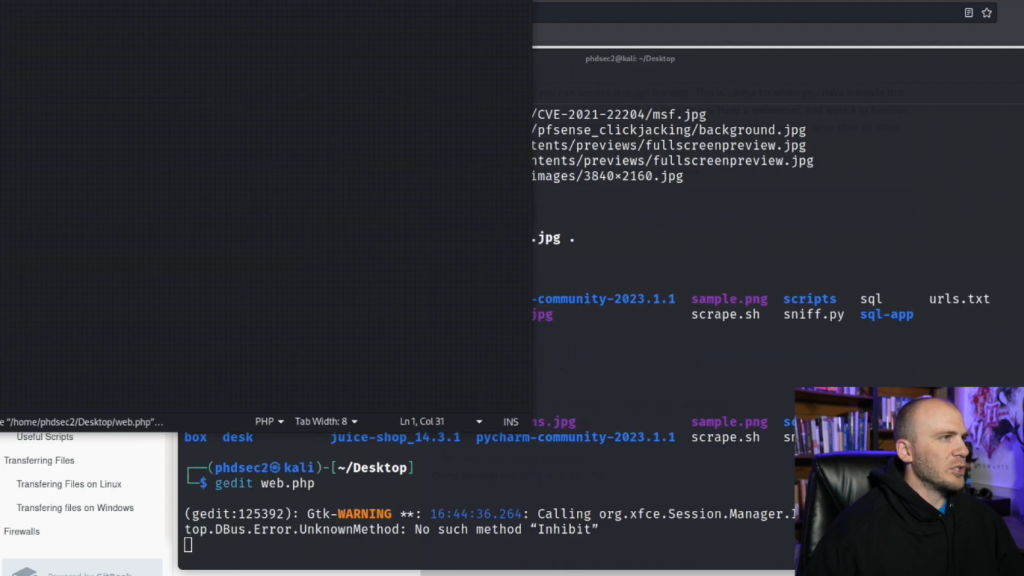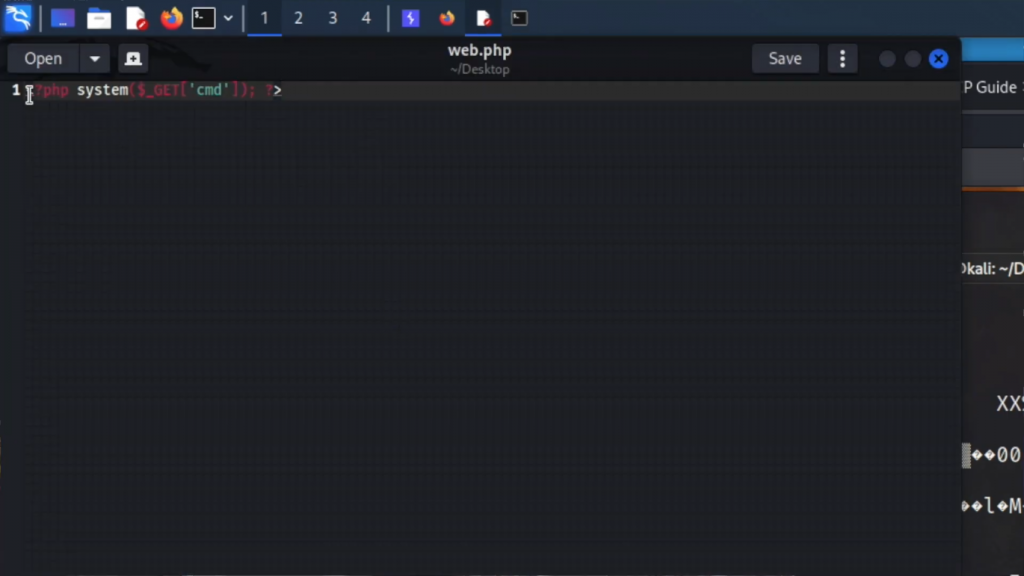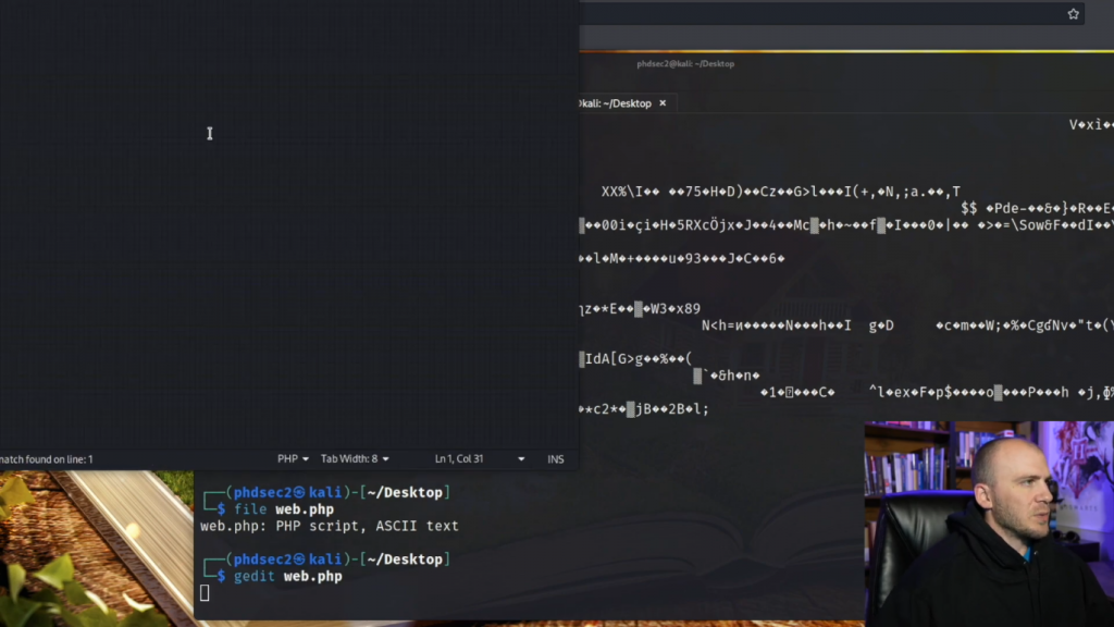 这样,它允许我们传入一个参数,并实际询问命令,而不是这里的我们必须每次都改变whoami。所以现在我们可以用gedit,我们要做一个叫web.php的文件。