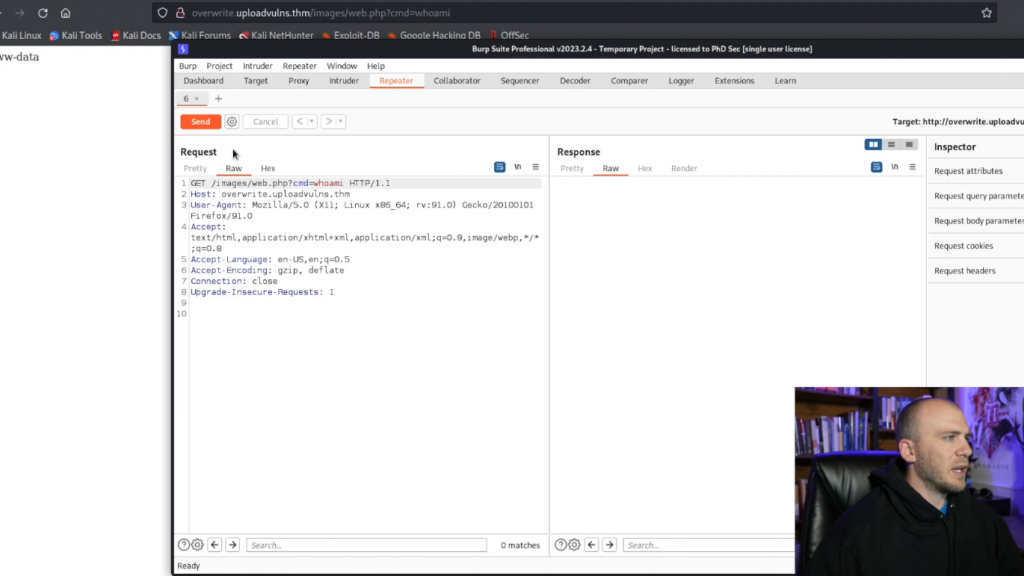 它告诉我们,我们已经覆盖了这个文件,这很好。我们其实不需要太担心这个问题。我们可以去/images路径。现在我们要看一下我们的webshell。所以,如果你还记得以前,我们去查看了我们的文件,它被称为 sample.jpg。而我们的页面就在这里。但我们想进入我们的webshell。所以我们可以进入web.php。这里什么都没有。而这是因为它事实上正在执行我们的代码。所以我们可以加一个?cmd=whoami。它将告诉我们,我们是在www-data。