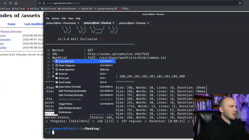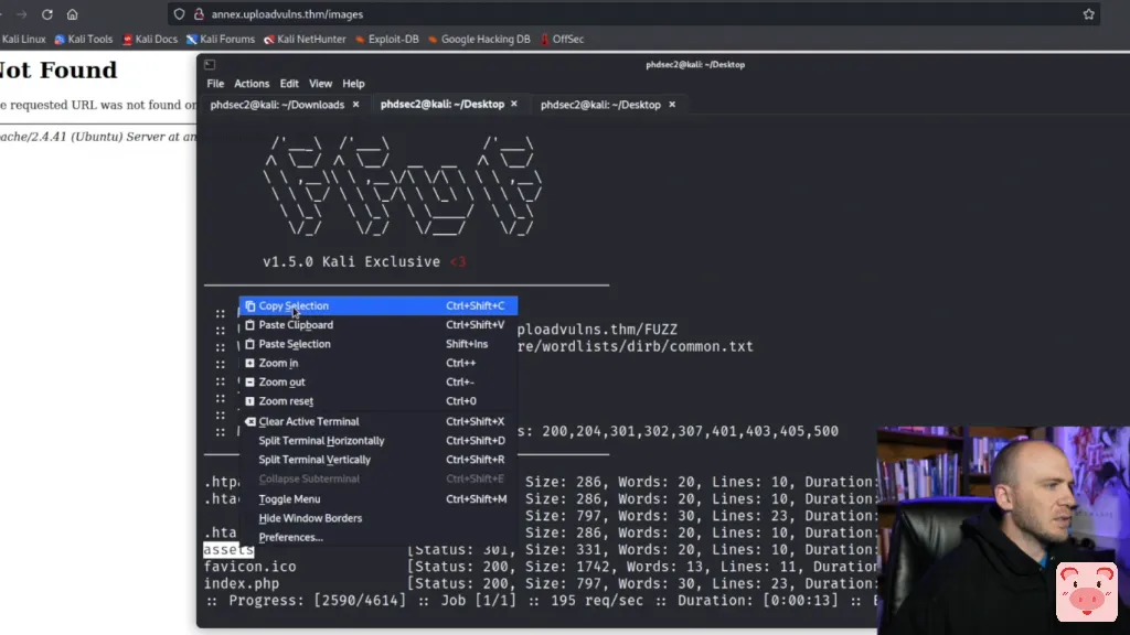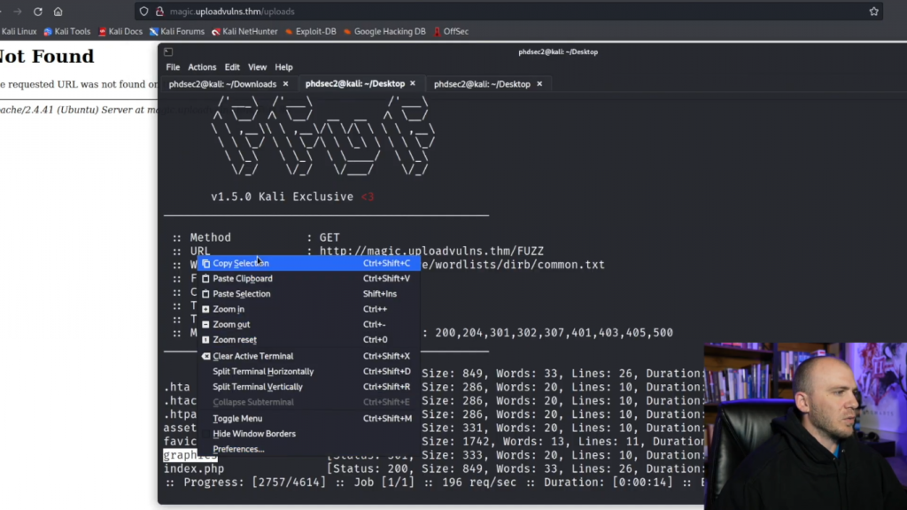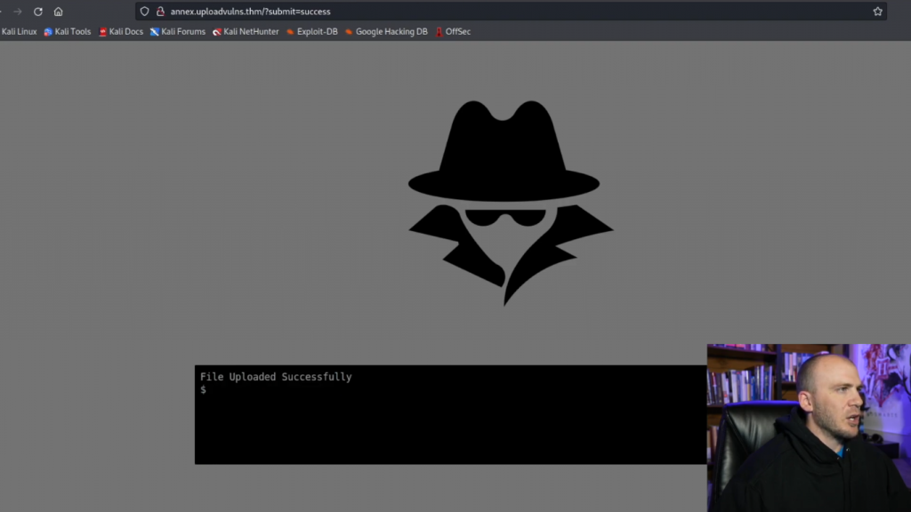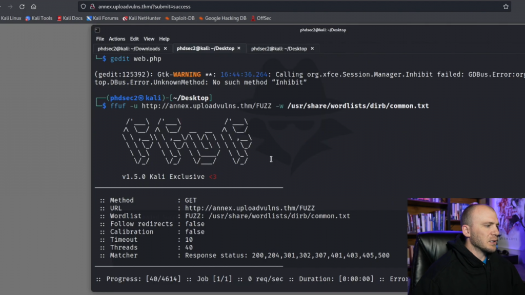 所以理论上它应该告诉我们这是个gif文件,并允许我们的PHP webshell上传。所以你可以上传这个文件,它告诉我们文件上传成功。现在,在很多CTF中,一半的战斗只是找到我们的文件实际上传的位置,这往往是一个问题。所以让我们继续吧。我们已经有了images,输入/images。我也许应该启动Fuff,这样我们就可以在尝试和猜测时真正找到它。让我们复制这个