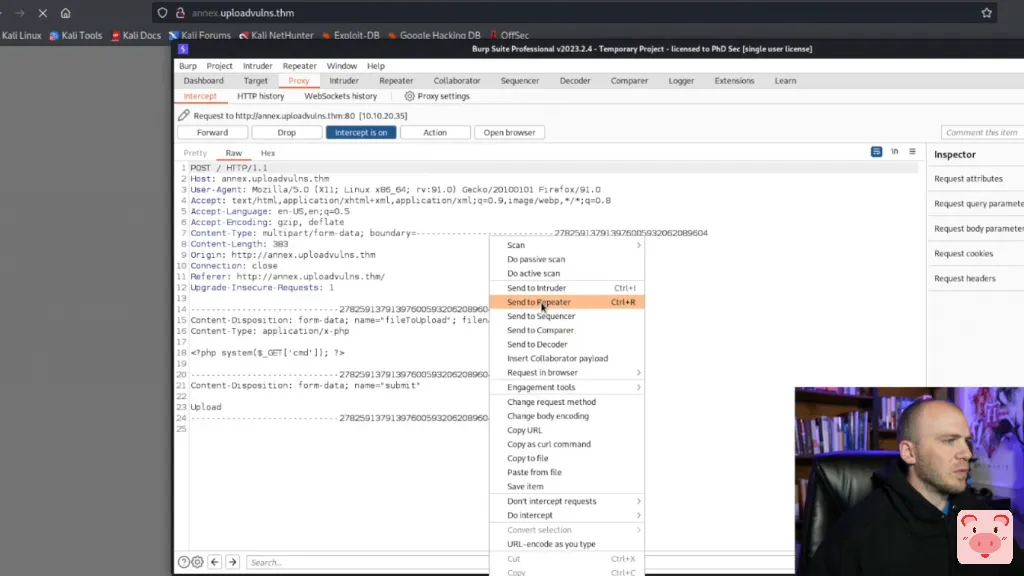 让我们在这里使用burp捕获它,输入上传。我们要把这个发送到一个中继器。