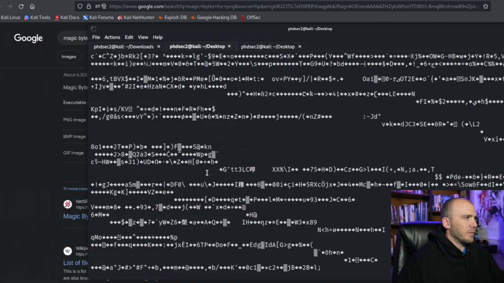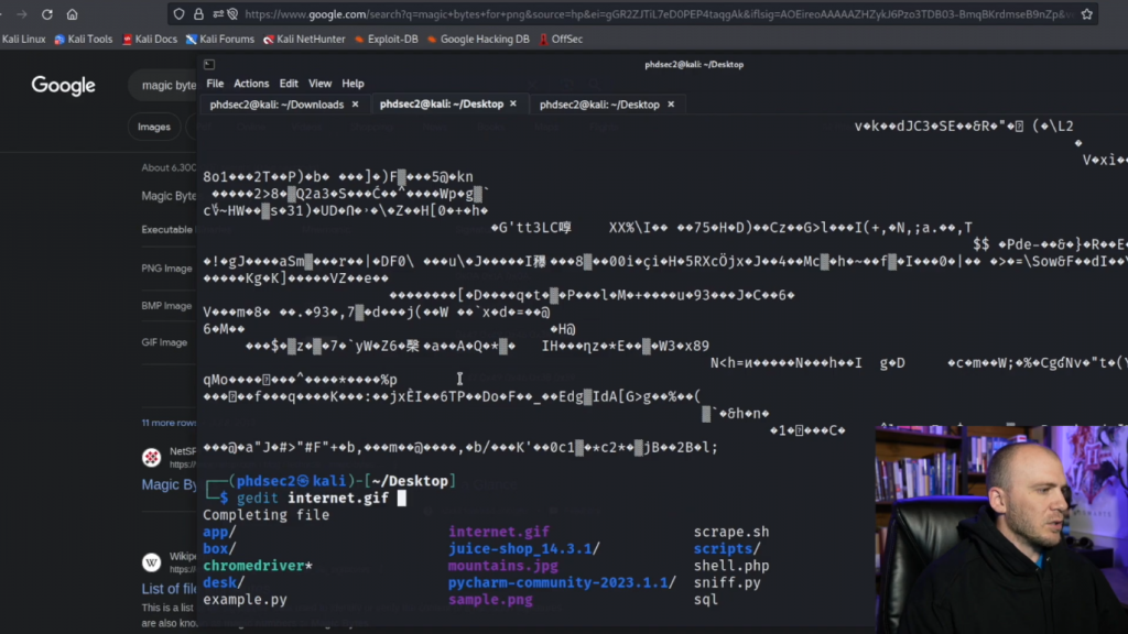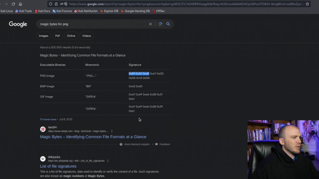 让我们继续并复制这个。所以有时当你做神奇的字节,让我们去复制,我们需要到这个的开头,我们要输入cp,我们需要回到结尾到当前的位置,这叫做internet.gif。因此,我们来到这里,我们实际上是在我们得到之前,我将告诉你一个寻找魔法字节的方法,就是来到谷歌,输入魔法字节(magic bytes)。所以你可以直接输入magic bytes for png或任何你想使用的东西。我们会复制这个,我们会去谷歌,因为我不小心关闭了使用这个作为搜索栏。你可以看到,你会有这些签名在这里。