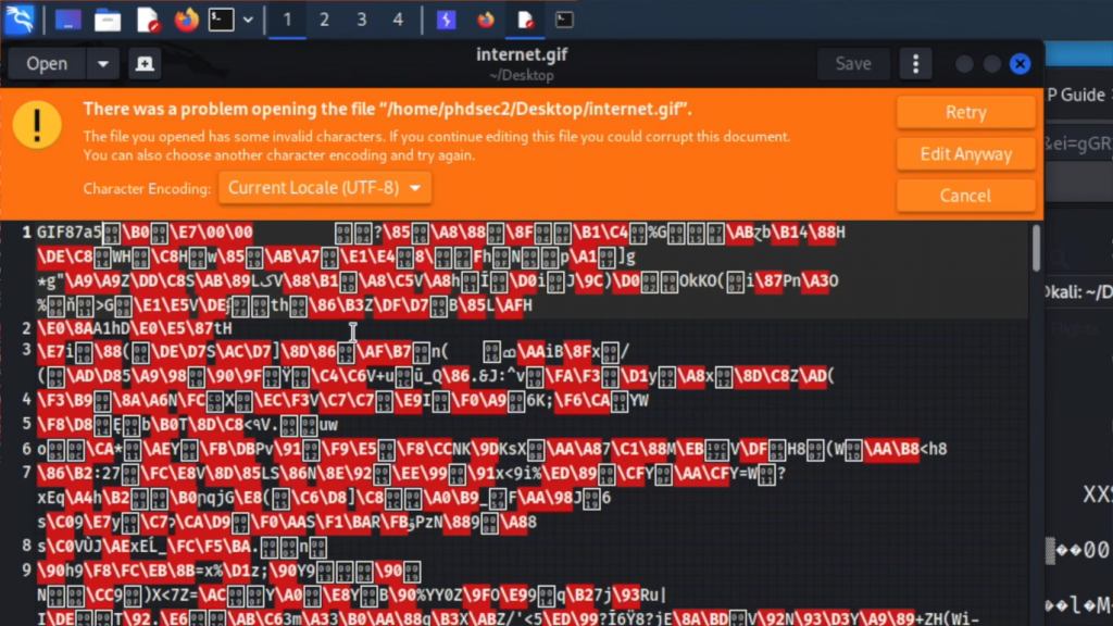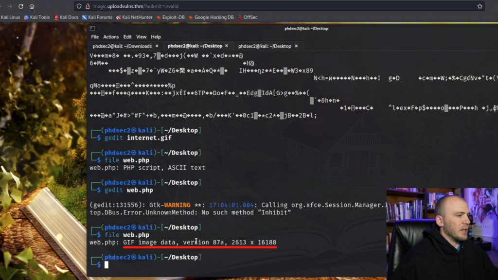 所以我们实际上可以在这里复制这个GIF87a5。所以我将继续并复制它。我们可以用它作为我们的魔法字节。所以,如果我们记得我们在这里的情况,如果我们在Web shell上输入文件,它会告诉我们这是一个PHP脚本。但是,如果我们使用gedit编辑它,
