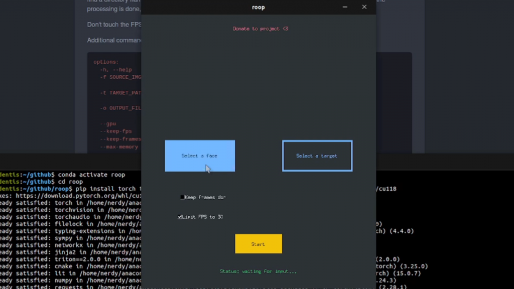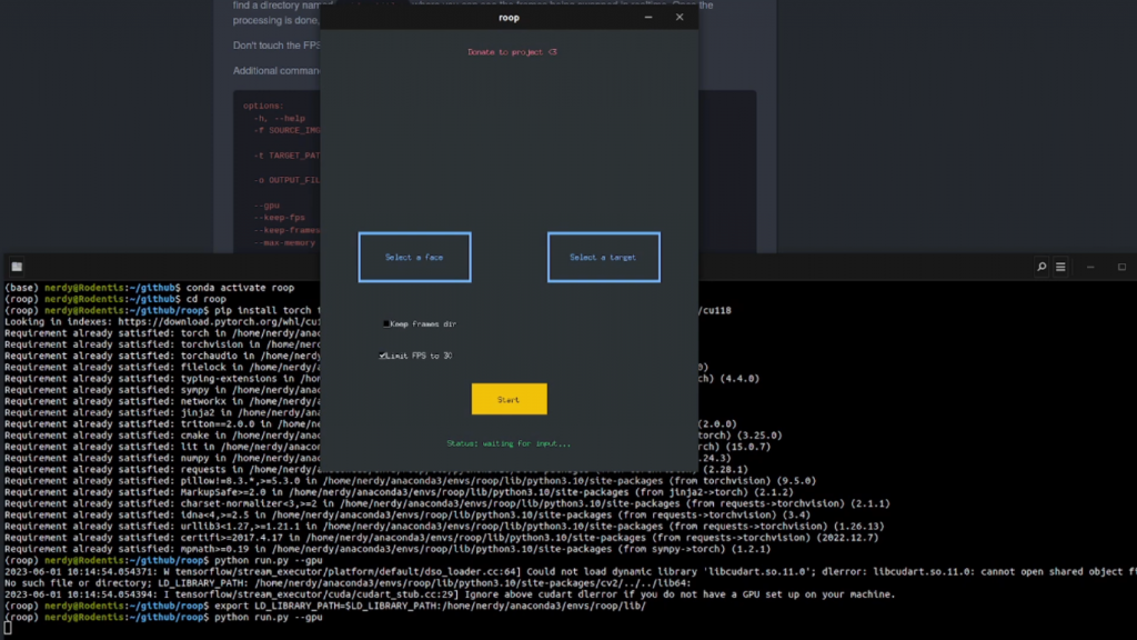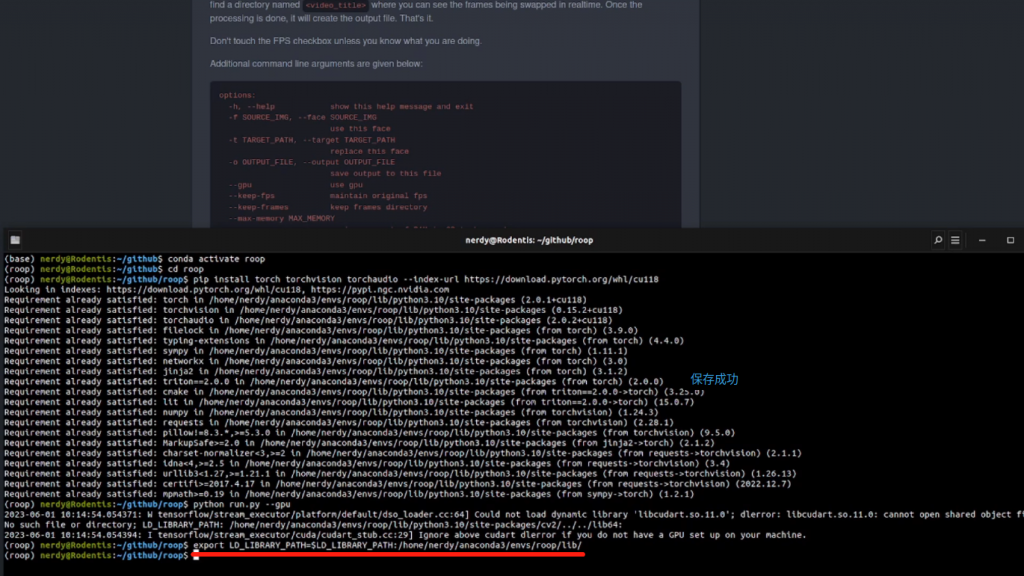 还有一些你可以使用的其他选项,正如你所看到的,帮助,和源图像,以及所有这些东西。所以,如果你愿意,你也可以在Cli模式下使用它,如果你确实遇到了类似的错误,无法加载动态库,以及所有这些的东西,那么不要担心,你只需要将其添加到你的ld库路径中,在我的例子中,是/home/nerdy/anaconda3/envs/roop/lib。