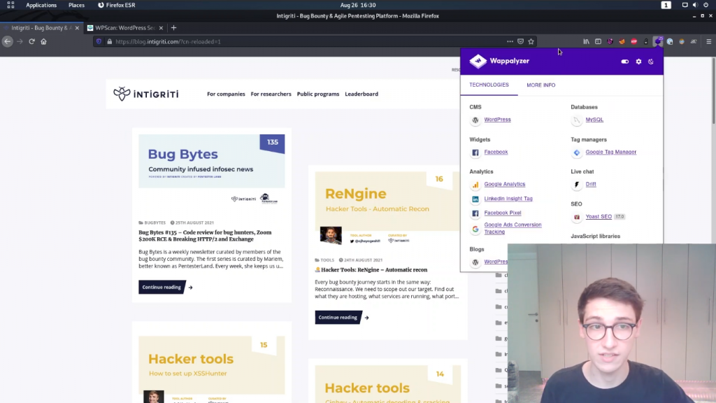 大家好,欢迎回到黑客工具的另一集。本周我们将关注WPScan,因为你的WordPress并不像你认为的那样安全,译制WordPress是巨大的,它无处不在。有些人甚至估计超过30%的公共互联网是建立在WordPress之上的,这真是太疯狂了。而这些网站都是安全的吗?不,并不是所有的都是安全的。所以,作为一个漏洞赏金专家,知道如何评估WordPress网站的安全是非常重要的。 默认情况下,你的WordPress,如果它是最新的,它很可能是安全的。除非你有一些零日在里面,否则它将是安全的。然而,在WordPress中已经发现了很多漏洞。所以,如果网站使用的是一个过时的版本,那么这可能会带来一些安全问题。然而,在WordPress中,你可以使用插件和主题,而这些可能是由外部或第三方开发者开发的,他们可能没有考虑到安全问题。现在,WordPress扫描是一个工具,它将扫描所有这些插件,它将扫描WordPress的版本和所有这些主题,然后它将对照一个巨大的数据库来检查发现的漏洞和插件及主题,它将说,好的,这个有漏洞或这个没有。所以这就是WordPress扫描的主要作用。然而,它可以做更多的事情。所以就像我说的,它可以扫描插件、主题、WordPress版本,但它也可以做用户名枚举,密码暴力破解,它可以搜索数据库转储的配置文件,它可以找到暴露的错误日志,媒体文件枚举等等。所以它可以做很多事情,现在我很想在运行这个工具时展示其中的一些东西。所以首先,我们显然需要一个WordPress实例,而且你知道Intigriti实际上在WordPress上运行它的博客。所以blog.Intigriti.com使用WordPress,事实上,如果我们看一下Wappalyzer插件,例如,我们也会看到它在使用WordPress。