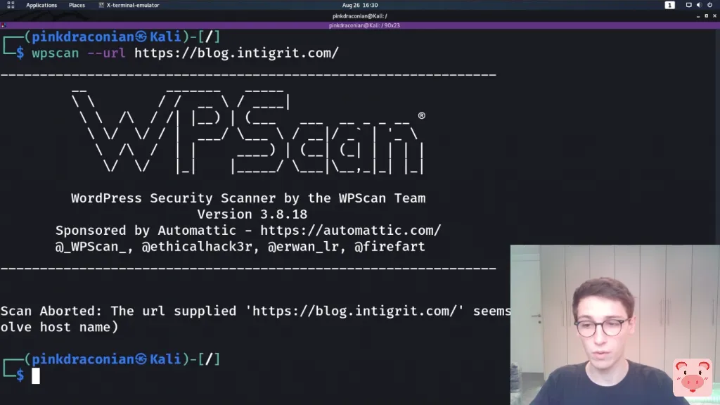 酷。说到这里,让我们到命令行去。让我们使用wpscan --url并提供URL。所以它是https://blog.Intigriti.com,运行时,我们看到扫描中止了,因为URL似乎是停机了。