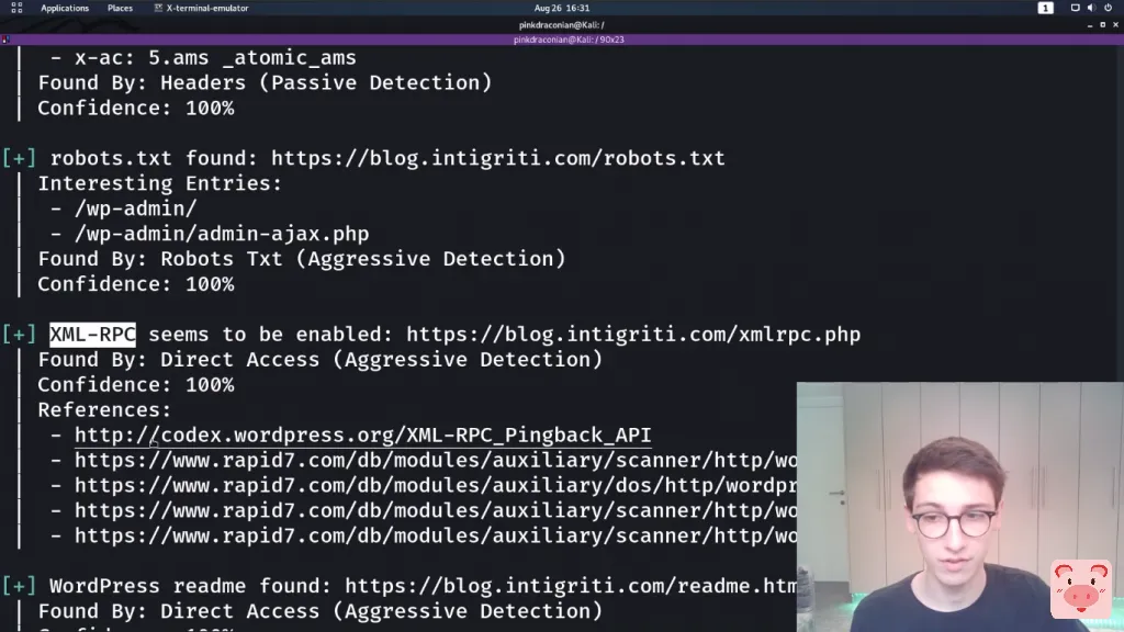 如果你的自动化工具不工作,尝试使用一个随机的用户代理,然后也许它将工作。而即时,我们在这里得到了很多的输出。所以我们来介绍一下这些输出。首先,它将向我们展示一些有趣的头文件。所以服务器是nginx,然后我们有这个奇怪的x-hacker头,等等。所以这很有趣。它发现了一个robots.txt,其中包含wp-admin,这里相当正常,xmlrpc似乎被启用了,如果你想阅读更多关于这个的内容,它有一些参考资料。