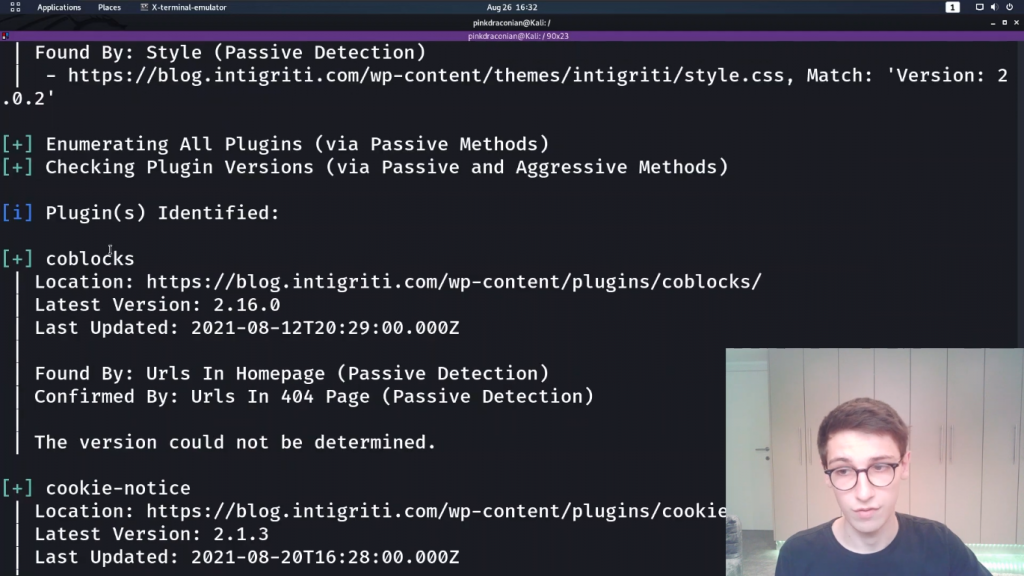 然后是正在使用的WordPress主题,它是Intigriti团队,所以它是一个定制的Intigriti团队,关于团队的一些信息,版本等等。现在它开始列举所有正在使用的插件。例如,Coblocks插件,它说,好的,这是我发现它的地方。最新的版本是2.16.0,正在使用的版本无法确定。